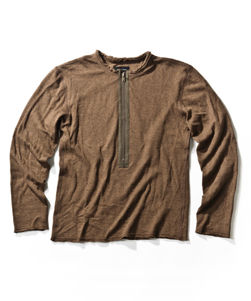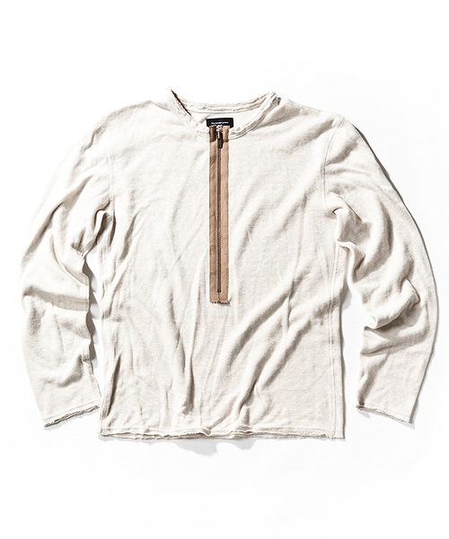 | Detail | 非常に柔らかで、着心地の良い接結素材を用いたカットソー。ディティールにはヴィンテージの軍物カットソーにも見られるファスナー開閉のハーフジップ使用。1枚で着用しても、アウターに合わせて時も着方も自由に選択できる万能カットソー。 |