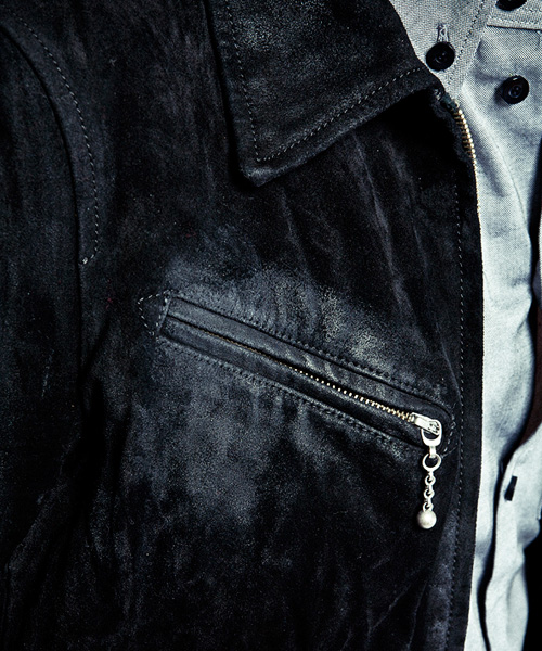 | Detail | 定番的な形でもある襟付のシングルライダーズを素材、仕様を変更したACANTHUSオリジナル仕様。素材には最高級のスプリットスウェードカーフを用いて、縫製後に惜しげもなく高度な加工をふんだんに施した。素材をデザインの表情に合わせて3種類の加工を施している。最高の素材に高度な加工を組み合わせたアイテム。 |