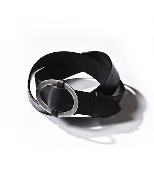 | Detail | 上質なRIOレザーを使用し1枚で仕立てたベルト。リングバックルは柱の無い珍しい形の物を使用。柱に代わりにバックル中心には革製の1本芯を走らせリングベルトの機能を果たしている。上質な革の質感とシンプルながら独特なベルトの仕様を楽しむ事にできる1本。 |