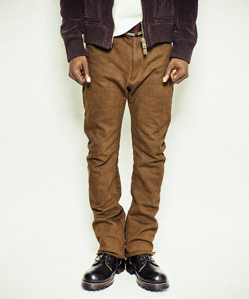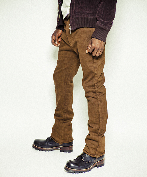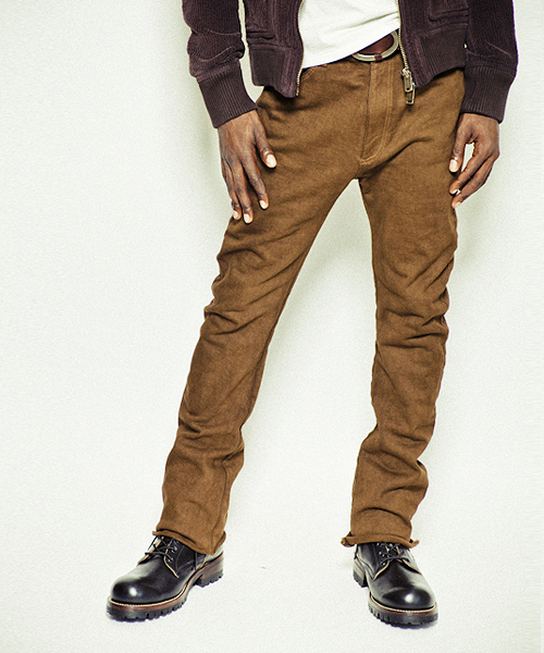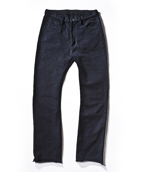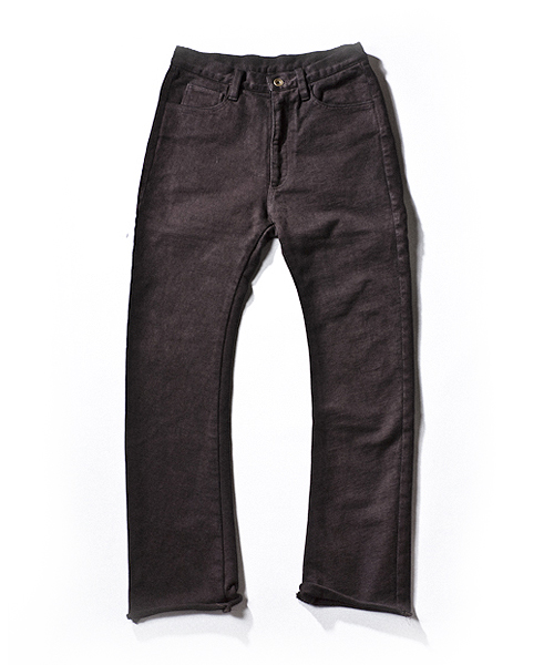 | Detail | 度詰めベビージャージ素材を使用したジャージパンツ。縫製後、硫化染めにより製品染めを施しておりアタリ感と、ウォッシュ加工、色のムラ感の表情が特徴。また股上に少しゆとりを持たせている為、着用時に程よい腰の落とし感の表情となる。全体のシルエットはタイトストレートシルエット。ジャージ素材ではあるが定番の布帛のパンツよりも重厚感、存在感を持つパンツ。 |