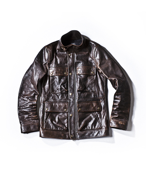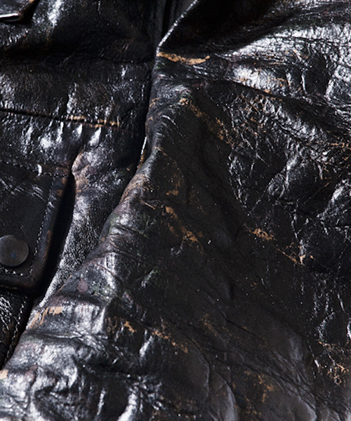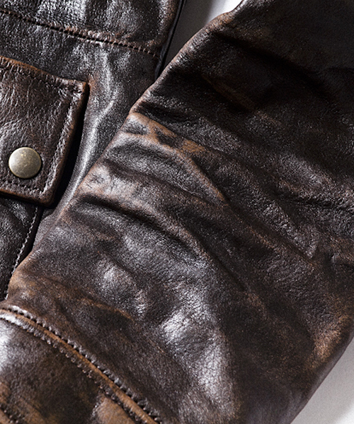 | Detail | カメラマンが着用しているイメージのモーターサイクルJKTをレザーにて表現。素材自体は上質で頑丈なキップレザーを使用し、内衿には柔らかいネイティブディアスウェードをしている。フロントの脇ポケットには便利なサイドポケットも合わせて6ポケット仕様。裏地には立体感を出す為にウォッシュ加工を施したオリジナルの迷彩生地を採用。さらにドラミング、職人による手作業の色落とし加工を施し上質で味わいの深い表情に仕上がった1着。 |