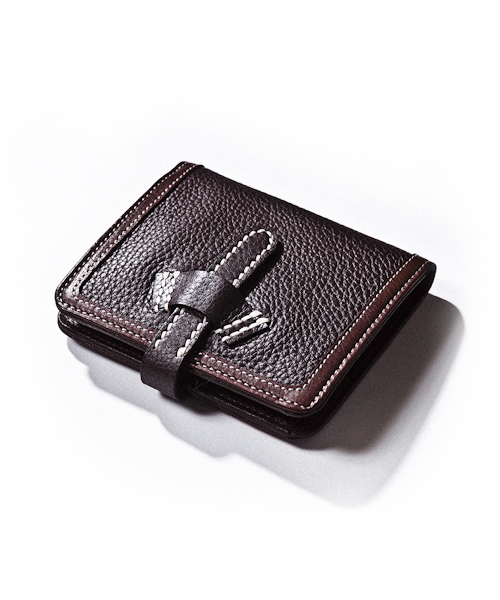 | Detail | 縁取りには固めのキップ素材を使用し、内側には天然のシボ感を持たせた異なった表情の革を使用。二つ折りのウォレット仕様で、ストラップにより容易に開閉できるようになっている。小銭、カード、札を入れるスペースも完備しているので使い勝手の良い仕様。使っていく毎に2つの革の表情の変化を楽しむ事のできる1品。 |