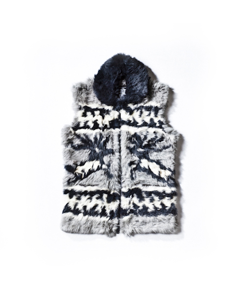 | Material | 素材は、セルペルサラビットファーを使用。このラビットはスペインの名門セルペルサ(世界最高峰のラビットファーのタンナー)に依頼した素材。そのラビットファーをふんだんに使用し、ニットにように手編みで作る技法(ニッティング技法)で編み込んである。ニッティング技法の中でも、このようなカウチン柄を編み込むのは、大変高度な技術と経験と時間が必要。ニッティング職人の中でもこの柄を編み込める者は世界に数人しかいないと思われる。 |