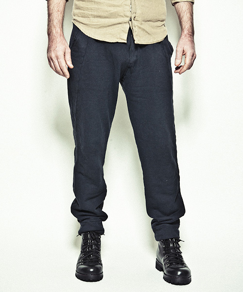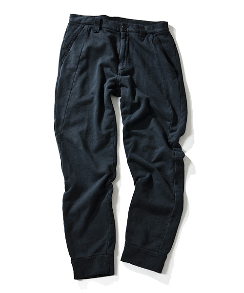 | Detail | HJ1203 tailored、HJ1204 basic shirtとセットアップでの着用が可能なジャージ素材のパンツ。腰ポケットは2つ、バックポケットは1つにして腰周りのディティールは、よりリラックス感を高めるためにシンプルなデザイン。履き心地は適度なゆとり感を持たせつつ、美しいシルエットを維持。素材は硫化染めを施してあるため、風合いを損なわずにカジュアルにもなりすぎない表情。素材、加工共に非常に高相性なアイテム。 |