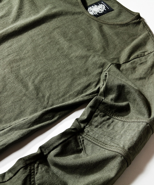 | Detail | ロング袖のTシャツを製品染めにて製作。ステッチワーク、切り替えを生かしたライダース風の表情がポイント。製品染めにより、生地の風合いもより増しておりシンプルながら存在感のある1着。 |