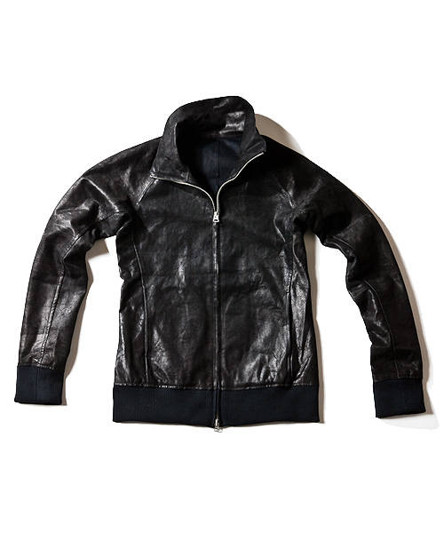 | Detail | 以前別素材にて展開していた“track”モデルの素材を変更したアップデートモデル。切り替えを追加し、裁ち切りのカッティングを生かしたパターン。ラグランスリーブにより運動量にストレスを感じさせない作りを考慮。また、普通に用いると裏地を要するレザーという素材を裏面に天竺ジャージを用いた一つの素材のみで仕上げてあるので驚く程軽量なジャケット。非常に相性の良い素材とデザインが合わさったアイテム。 |