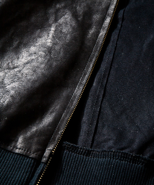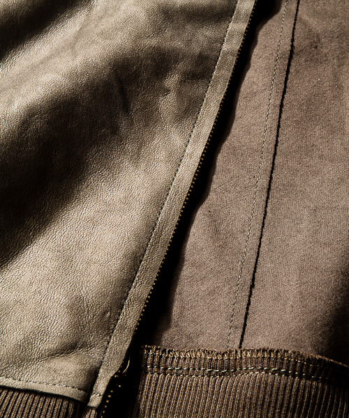 | Material | 素材のレザーには、ラムベジボンディングを使用。上質なベジタブル鞣しのラムレザーを、わざわざペーパーをかけてギン面を擦ることによりヴィンテージ感を出した逸品を極限まで薄く漉いて(0.4mm)創りこんだレザー。その皮革のトコ面に厳選した天竺ジャージをボンディング加工。その後裁断、縫製後に製品にて軽くもみ洗い加工する事でナチュラルなヴィンテージ感を演出したレザー。 |