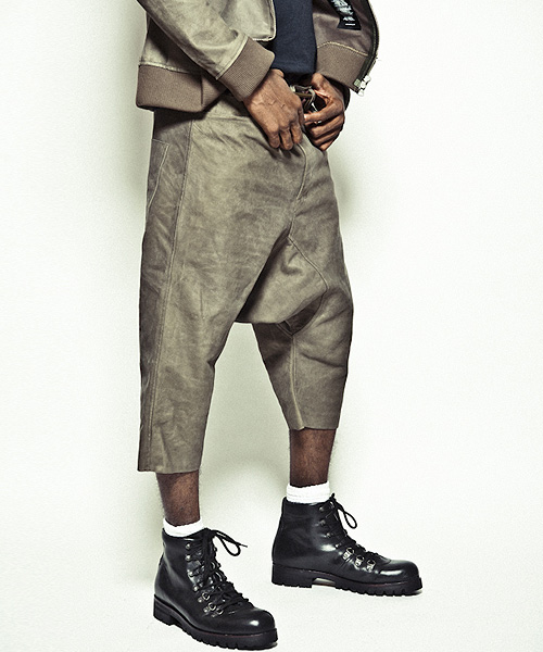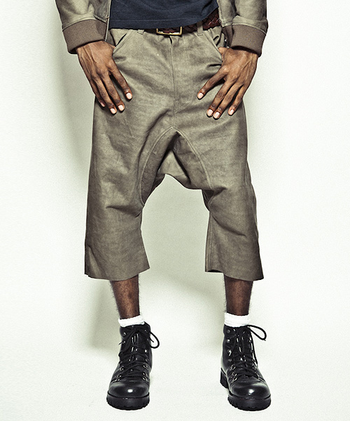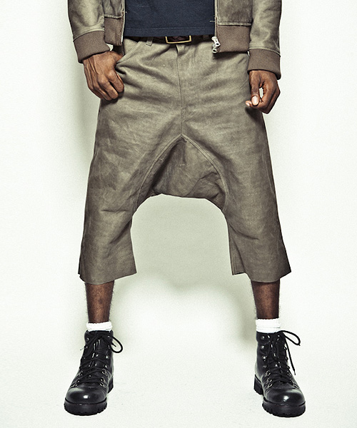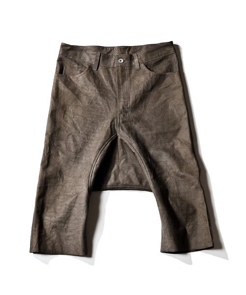 | Detail | サルエルパンツを、ボンディングレザーで製作。デザイン自体は5ポケットのシンプルなデニムをイメージ。バックポケットの位置は後ろから見たシルエットを考慮して綺麗に見える位置に配置。また、このボンディングレザーは素材自体の硬さは残っているが、一枚での製作が可能で、断ち切りパーツを配置する事で非常に軽い仕上がりが実現。レザー素材ではあるがリラックス感のあるデザインと素材が合わさり存在感のあるアイテム。 |