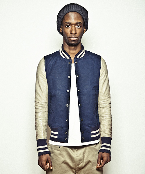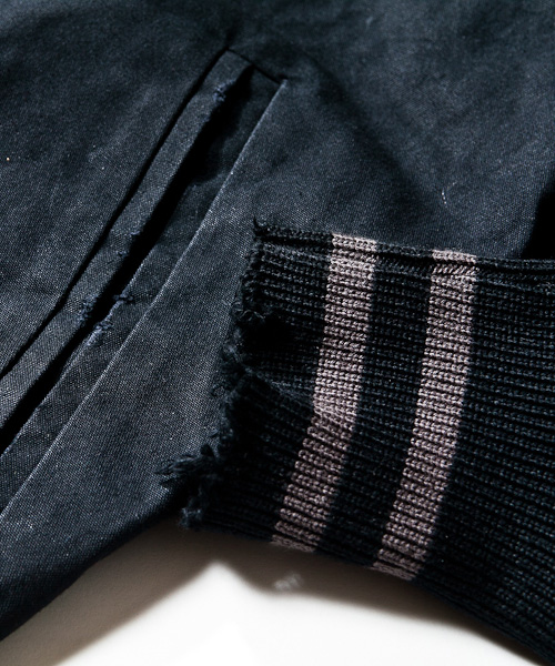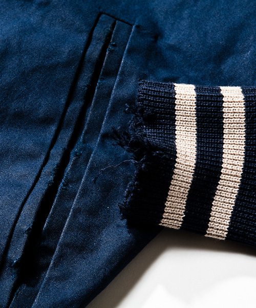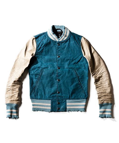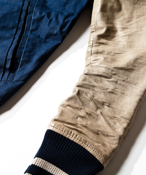 | Detail | 春夏仕様のスタジアムジャンパー。袖には秋冬のグローブレザーとは異なる軽い着心地を実現するベジタブルラムレザー。身頃にはレザーに負けないような頑丈なパラフィン加工を施したキャンパス地を使用。味のある素材に、手作業によるダメージ加工を施すことでヴィンテージ感を増している。着用時に生まれる袖部分の自然なシワを表現した3D加工はACANTHUSオリジナルの加工。リブは配色、ラインの太さを全体のバランスに合わせたACANTHUS別注リブを使用。今回は裾、袖と共に一枚仕立てのリブなので軽い着用感を高めたている。パターンにて極限まで絞った美しいシルエットを楽しむ事ができるスタジアムジャケット。 |