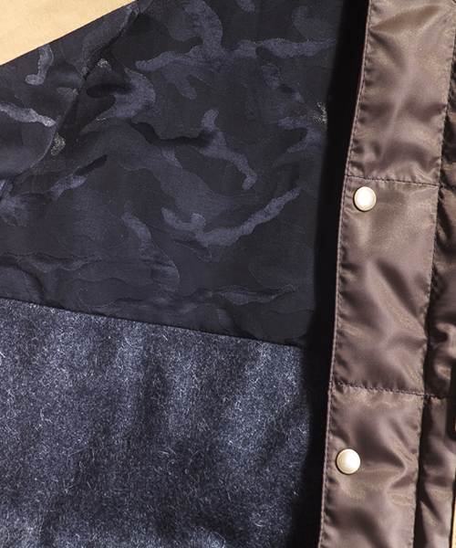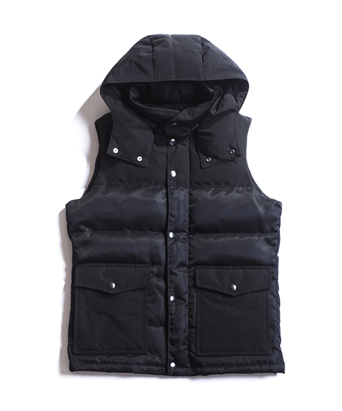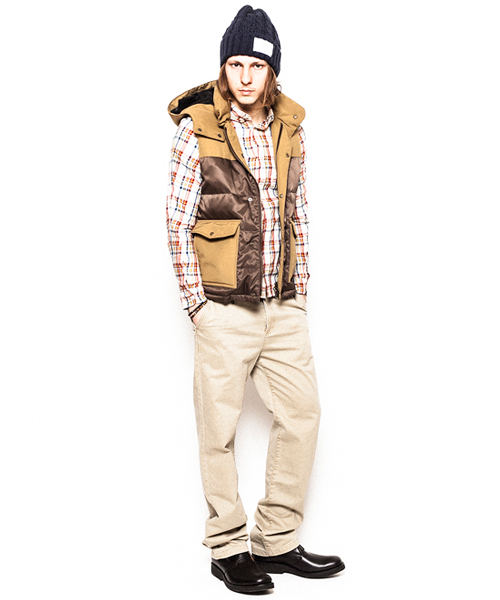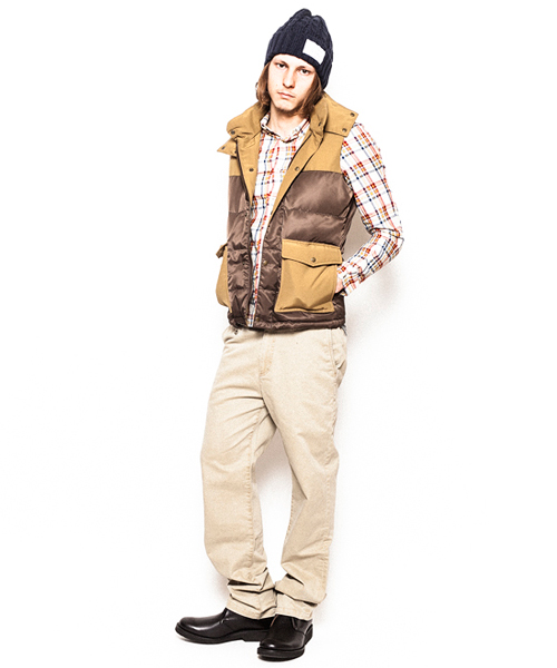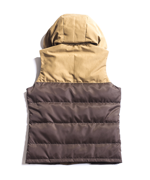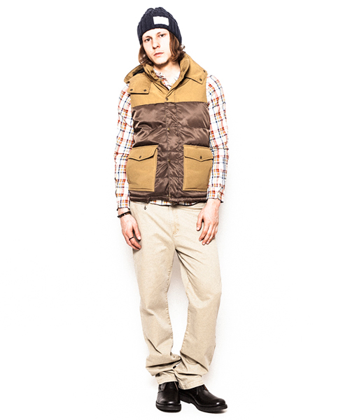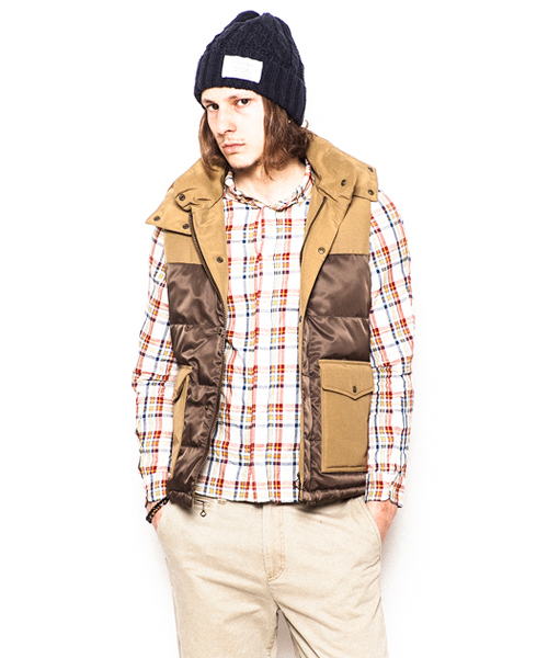 | Detail | 上部と脇ポケット部分に通称6/4クロス、下部分にはナイロン100%の素材を使用したマウンテンライクなダウンベスト。ダウンの素材には品質の高いグースダウンを使用し、ふっくらとした表情と保温性を持つダウン80:フェザー20の割合を設定。ファスナーにはTALON社製の物を使用。裏地には迷彩裏地を使用。腰から下部分はウール素材で切り替える事で腰回りの保温性を確保してしている。フードは取り外し可能。 |
