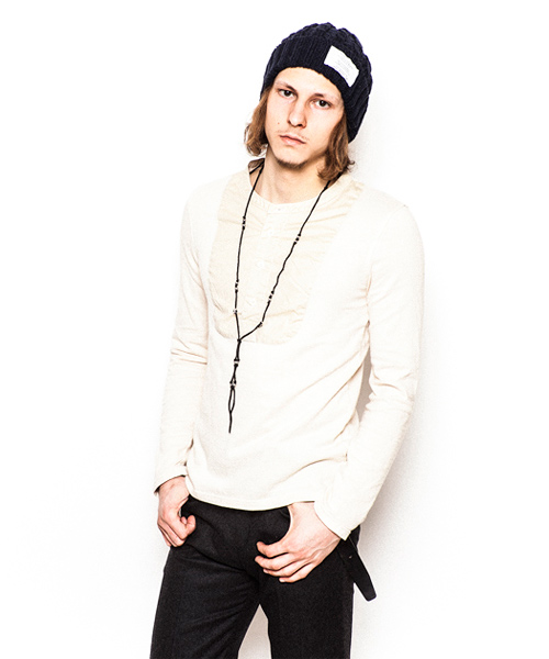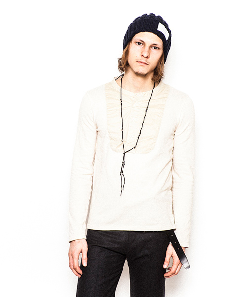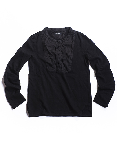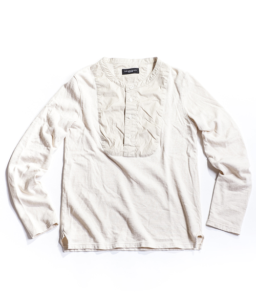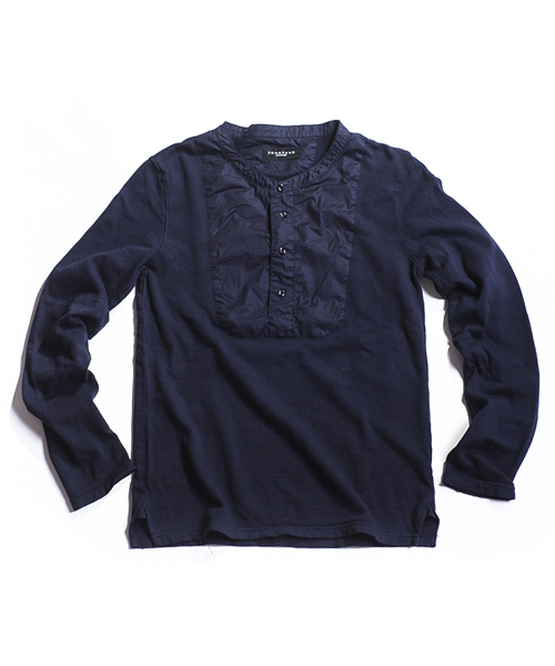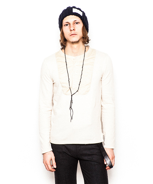 | Detail | 衿周りにはストレッチ性のあるブロード素材で切り替えたヘンリーネック仕様のカットソー。ディティールは30年代の肌着を取り入れている。白はボイル加工。Navy,blackは製品染めにて色味を出している。薄手の裏毛を使用している為シーズンを問わずに着用可能な一枚。 |