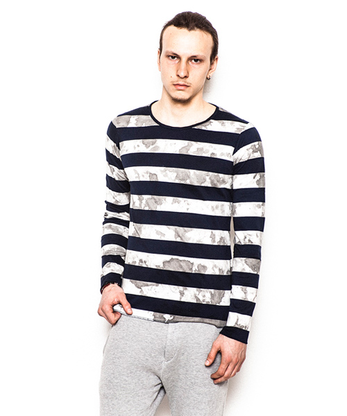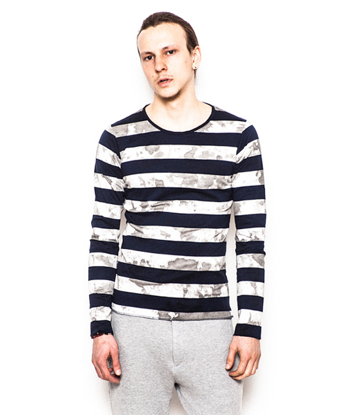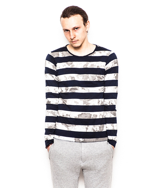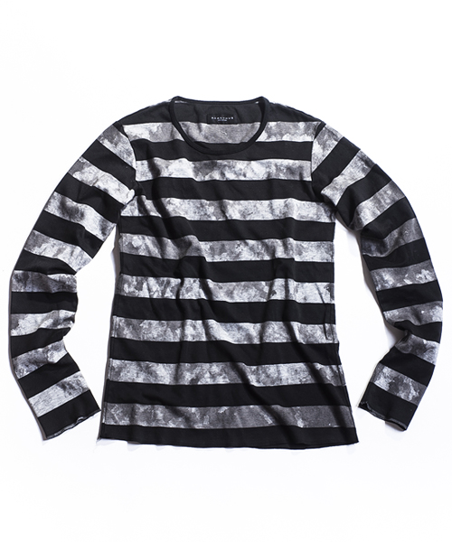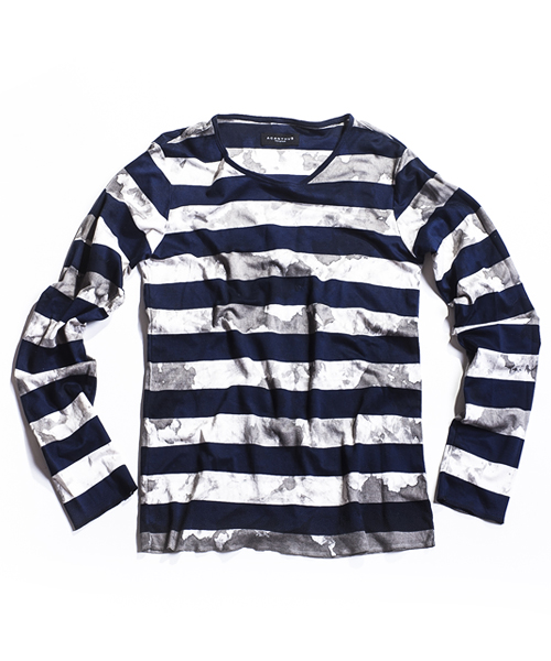 | Detail | ポンチ生地を贅沢に使用したボーダー柄のカットソー。袖、裾はロック始末にてラフな仕上がり。縫製後、手作業によるムラ染めを施している為1点1点仕上がりが異なる特別感のある1着。 |