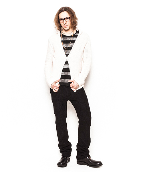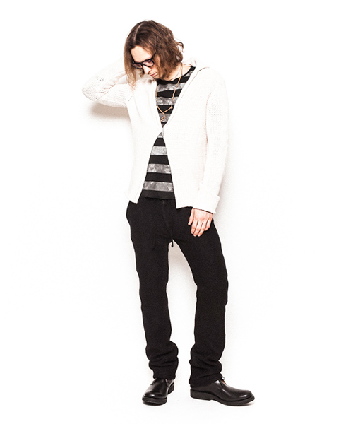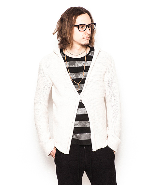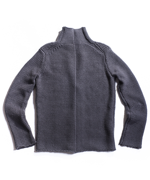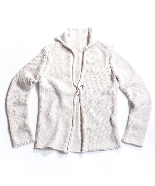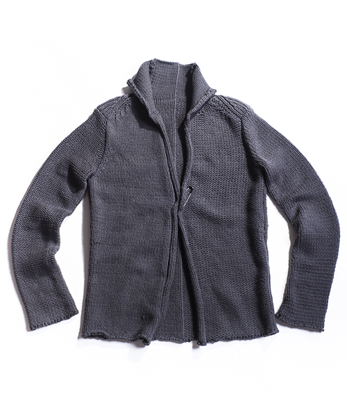| Detail | コードヤーン仕様。本数取りを多くしてバルキー感(厚手感)を強調している。組織は1.5G仕様。表目と裏目を使い分ける事で段差が生まれ凸凹感が編地に表現される、こういった組織をリンクス柄と呼ぶ。今回は大胆な切り替え方でリンクス柄を仕様しており、衿部分は綺麗に衿が反り返る様に一手間編地に工夫している。デザインはローゲージのラフに羽織るタイプのカーディガンで、レイヤードにも重宝される丈に仕上げている。ピンが1本付属で付いているので、自由な着こなしに活用してほしい一枚。 |