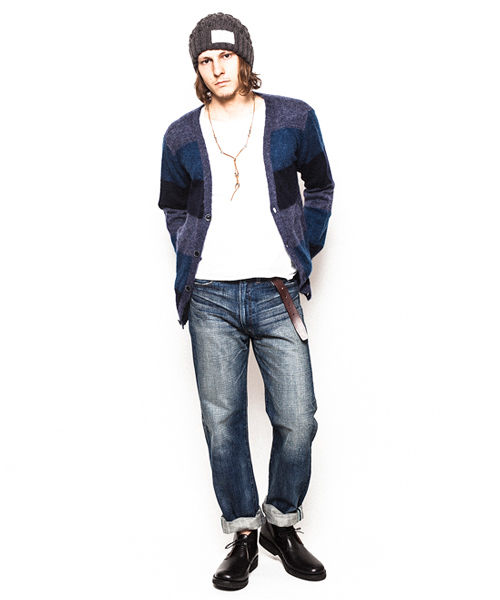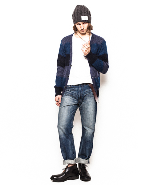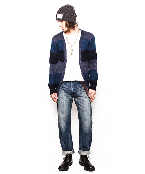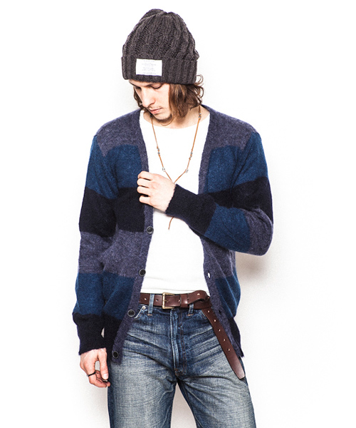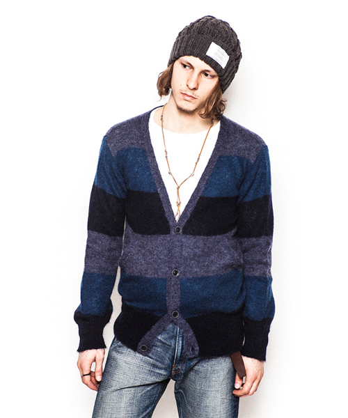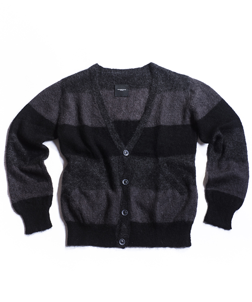 | Detail | 混率の多くに高級なキッドモヘアを使用しているアイテム。毛足が長く、ソフトで膨らみがあり、軽く仕上がるのが特徴。組織は7G仕様。デザインは3色使いのボーダーでまとまり良い配色に仕上げている。特に風合いには気を使い洗いをかけて起毛を施しており、着用しやすいく重くならない様に風合いに仕上げている。様々なスタイルに対応できるモヘアカーディガン。 |