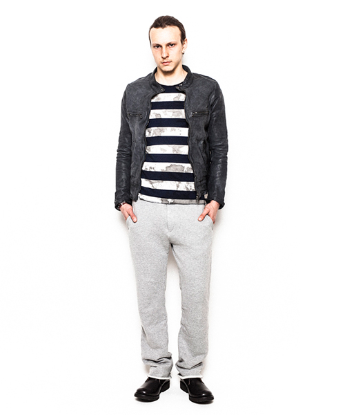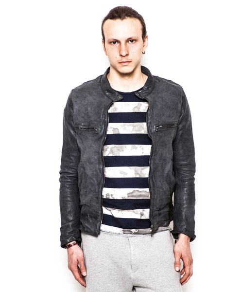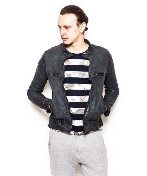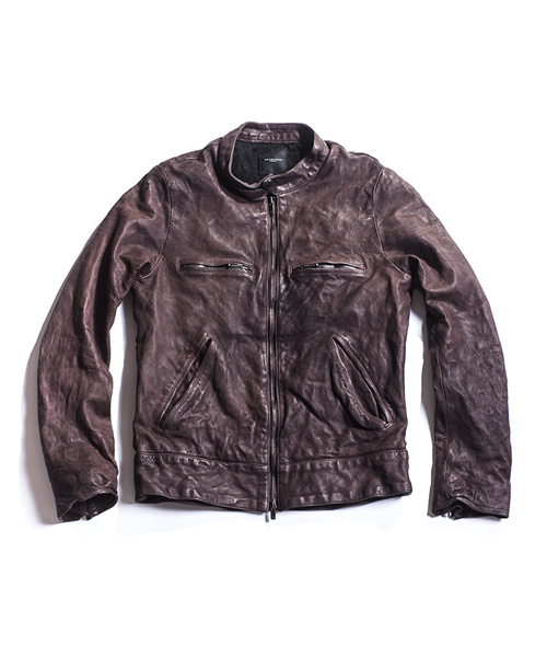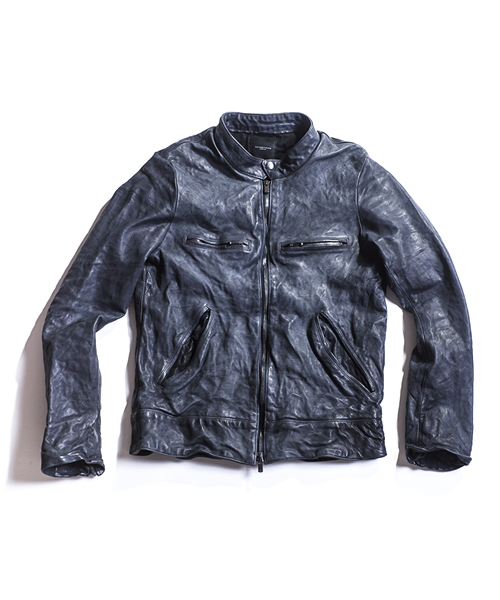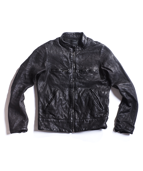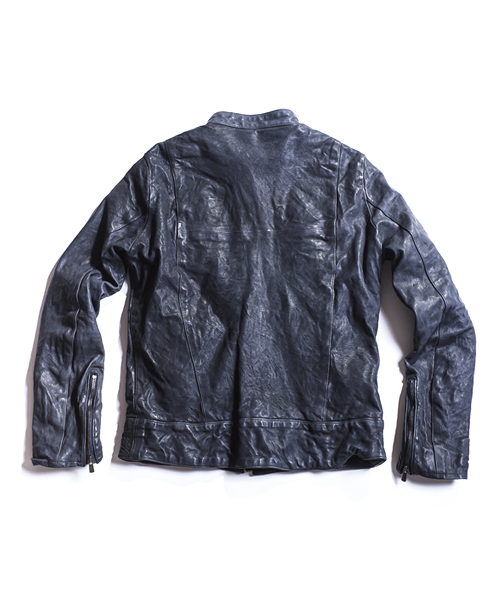 | Detail | カーフという稀有な素材を製品染めする事で生まれる表情を損なわない為に無駄を省いたシンプルなデザインのシングルライダースにて製作。身頃裏にはコットン60%ナイロン40%のいわゆる6/4クロスの迷彩ジャガード生地を採用。袖にはキュプラ素材を使用。ファスナーにはハードな製品染め加工に耐えうるEXCELLAファスナーを採用。オイルをたっぷりと浸透させて製品染めを施す事で滑らかな質感を実現している。製品染めでしか表現できない色味と素材感、革の価値を十分に体感する事のできる1着。 |