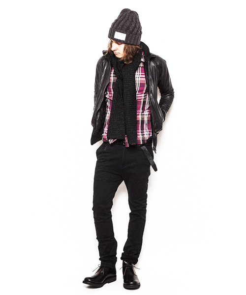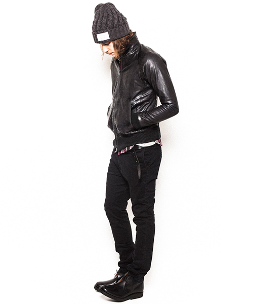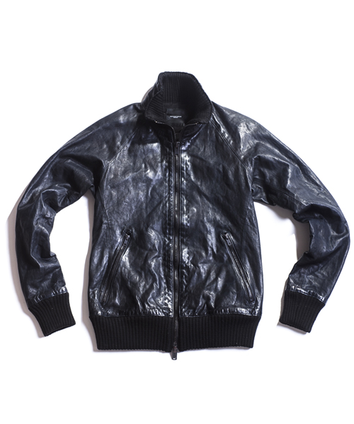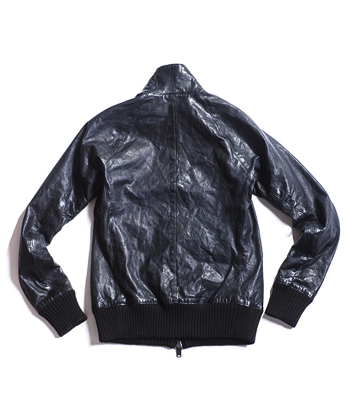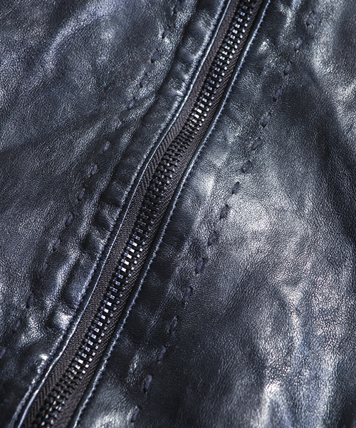 | Detail | 表情豊かなシープ革を使用したトラックJKT。身頃裏には6/4クロスの迷彩ジャガード生地を採用。袖には袖通りの滑らかなキュプラ素材を使用し、各リブには裏面にゴム糸を走らせる事で表面から見た際に独特なラインの入った表情を持たせたオリジナルに編み立てたリブを採用。ファスナーには素材のヴィンテージ感に合わせTALONファスナーを使用。フロントには1番手の極太糸を使用したハンドステッチを追加している。全体的に軽いシワ加工に加え、ドラミング加工を施している。さらに職人による特殊な塗料と熱を加える事で光沢感を表現する手作業による加工を施している。3工程にも及ぶ加工の結果、独特で深みを増した革の質感を表現したトラックJKT。 |