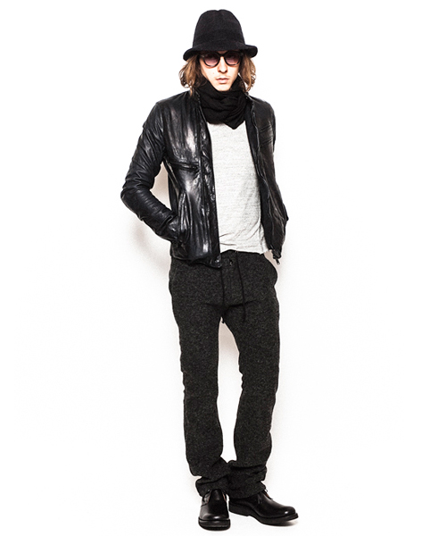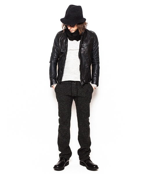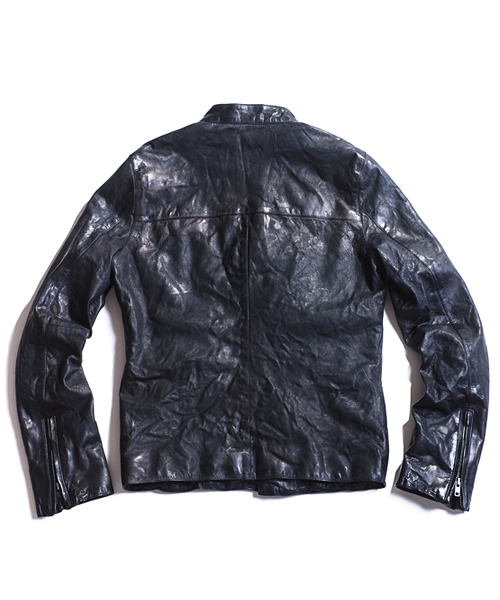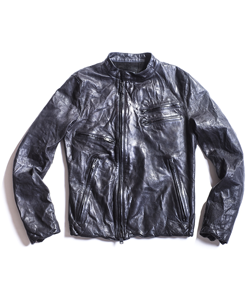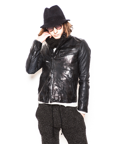 | Detail | 表情豊かなシープ革を使用したライダースJKT。身頃裏には6/4クロスの迷彩ジャガード生地を採用。袖には袖通りの滑らかなキュプラ素材を使用し、ファスナーには素材のヴィンテージ感に合わせTALONファスナーを使用。フロントファスナーの位置を右身頃側に少しだけずらしている。全体的に軽いシワ加工に加え、ドラミング加工を施している。さらに職人による特殊な塗料と熱を加える事で光沢感を表現する手作業による加工を施している。3工程にも及ぶ加工の結果、独特で深みを増した革の質感を表現したライダースJKT。 |