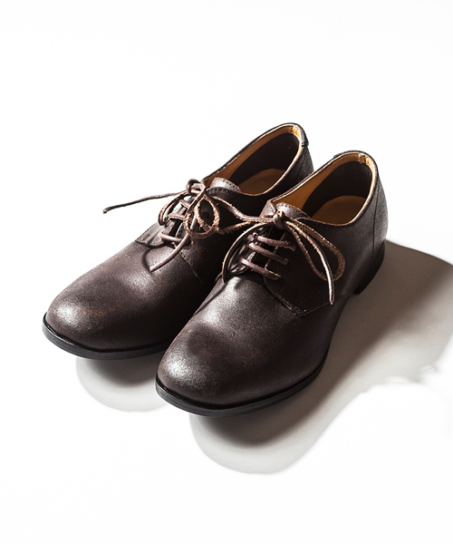 | Detail | デストロイレザーにて製作したプレーントウタイプの短靴。つま先は若干そり立っており、マッケイ製法を生かして極力コバはスマートの設定。紐には革タイプ、ろう引きタイプの2種類を付属として用意。経年変化によって革の表情の変化を十分に楽しむ事のできる1足。 |