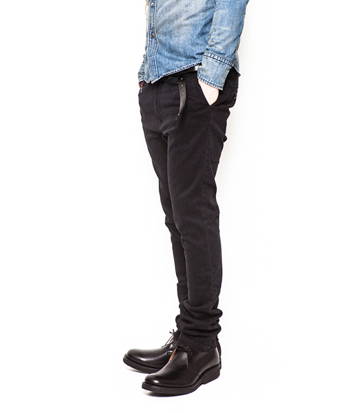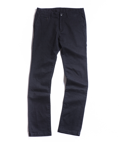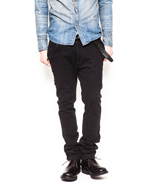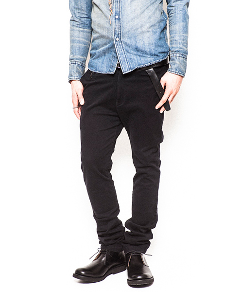 | Detail | ストレッチ性を持ったチノ素材を使用したタイトチノパンツ。TALON社製のファスナー、釦には水牛釦を使用。右腰にはコインポケットを配置した5ポケット仕様。縫製後バイオボールウォッシュ加工を施し適度なアタリ感、生地の加工感を追加。股上を深めに設定し、裾に向かってテーパードさせたタイトシルエット。 |