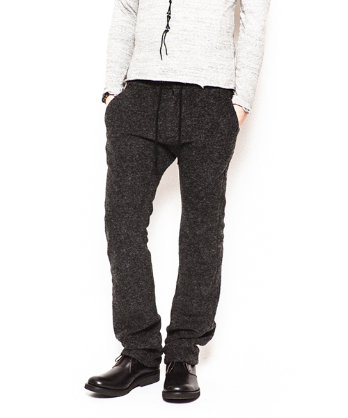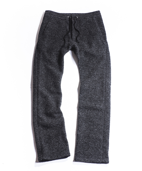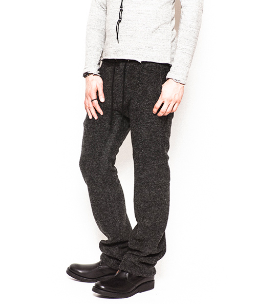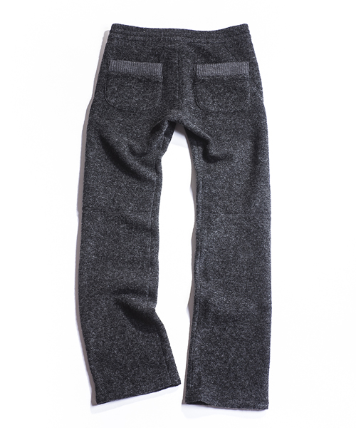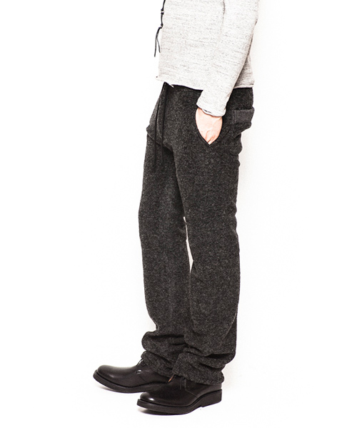 | Detail | 縮絨ウールニット素材を使用したイージーパンツ。裏地にはコットン素材にて着用感の向上を配慮。ウエストはドローコードにて調性可能。ファスナーにはTALON社製の物を使用している。シルエットはニットの伸縮性を生かした程よくタイトな仕上がり。寒さの厳しいシーズンでも一枚で対応できるウォーム感のある1本。 |