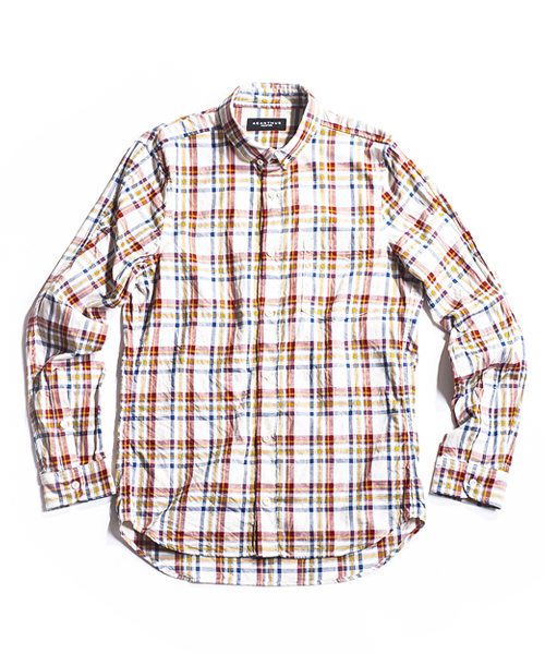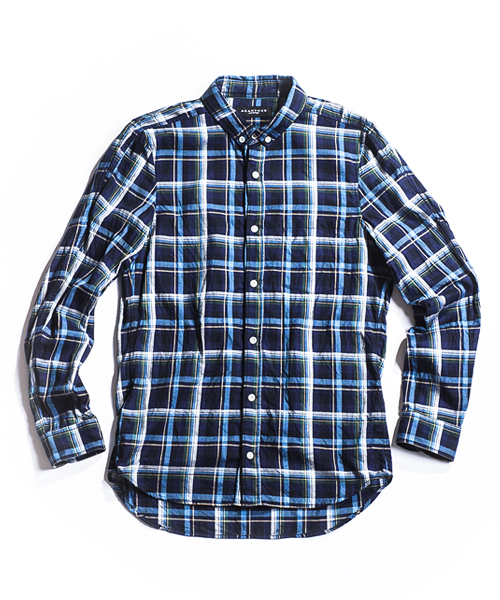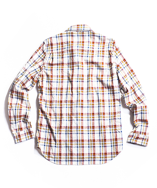 | Detail | SH1308と同型。こちらはチェックオックス生地を使用。釦には本貝釦を使用。第3、第4釦には表裏にボタンが付き、おがみ合わせで釦を閉める事も可能な仕様。おがみ合わせにすることで、よりラフな着こなしを楽しむ事ができる。肩に三角型の切り替えを追加。毎回微調整を加え、定番的にリリースしているB.Dシャツ。縫製後ワンウォッシュを施している。 |