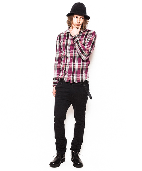 | Detail | 釦にはブタ鼻型の金属釦を使用。ヨーク裏、裏衿、袖裏等はオックス生地にて切り替えている。第3、第4釦には表裏にボタンが付き、おがみ合わせで釦を閉める事も可能な仕様。おがみ合わせにすることで、よりラフな着こなしを楽しむ事ができる。チェック柄を生かしたシンプルなデザインで縫製後、シワ加工を施している。 |