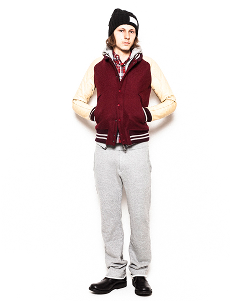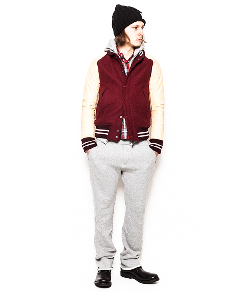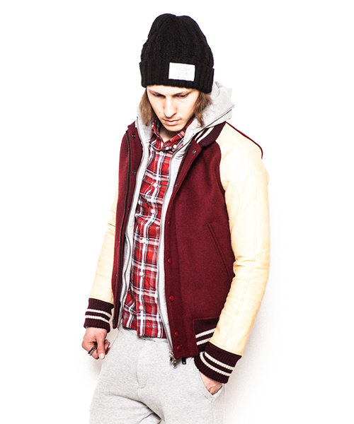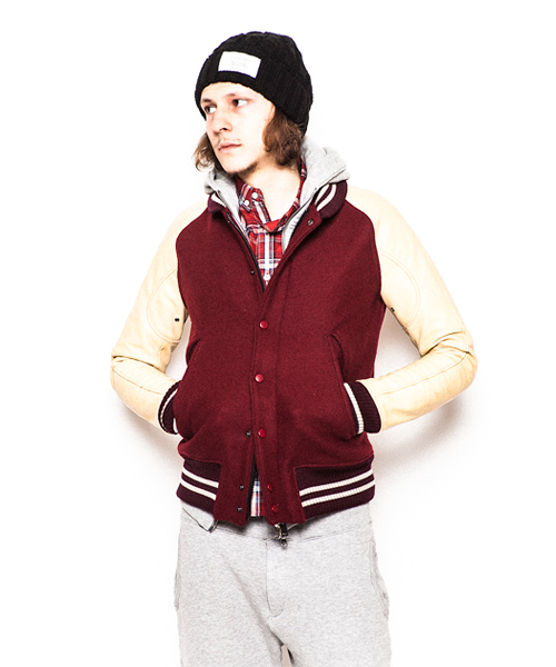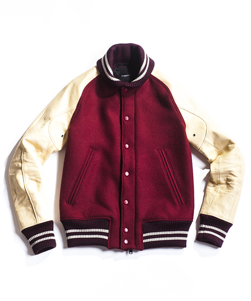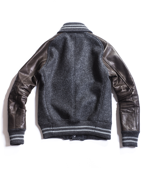 | Detail | 身頃にはメルトン、袖にはカウレザーを使用。今回のモデルはアームのストレスを軽減するラグランスリーブを採用し着用時に生まれる袖部分の自然なシワを表現した3D加工はACANTHUSオリジナルの加工。リブの配色、ラインの太さも全体のバランスに注意した特注リブを使用している。ファスナーにはTALON社製の物を使用。ドット釦は同色系のレザーでくるんだくるみドット釦を仕様。black×black色のアームには職人による手作業によって下地の色を浮き出させる加工を施している。使用した素材、縫製、加工すべてに技術と拘りの詰まったアイテム。ワッペン付き、ワッペン無しの二種類を用意。 |