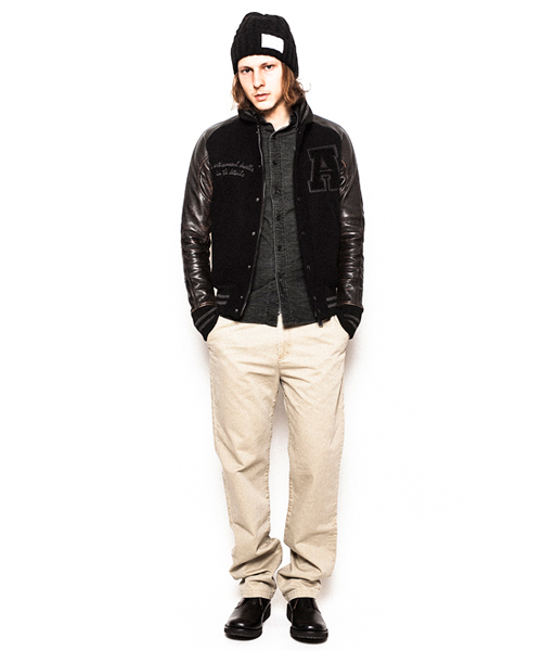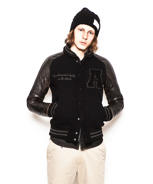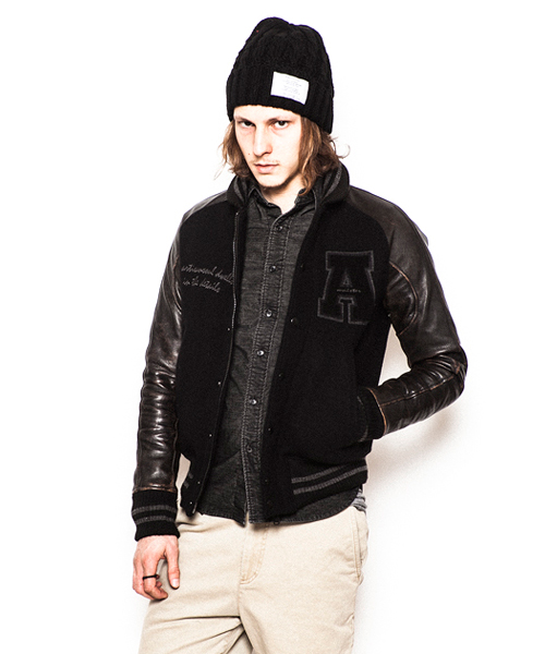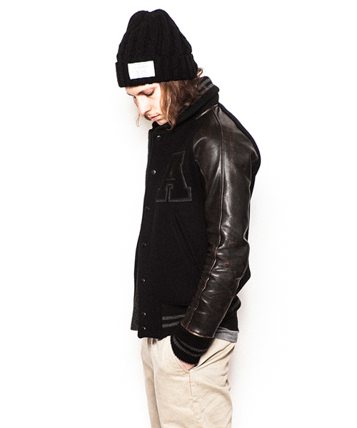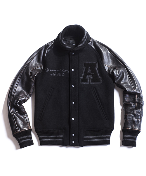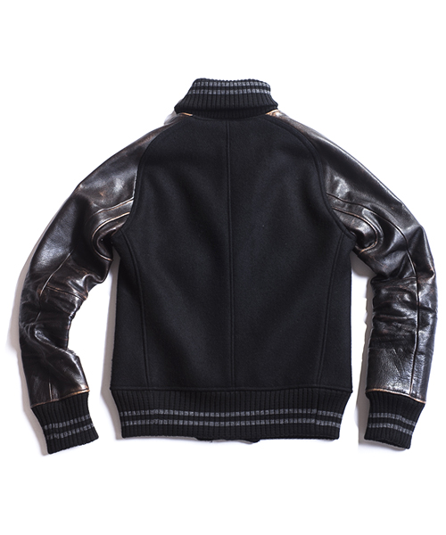 | Detail | 身頃にはメルトン、袖にはカウレザーを使用。今回のモデルはアームのストレスを軽減するラグランスリーブを採用し着用時に生まれる袖部分の自然なシワを表現した3D加工はACANTHUSオリジナルの加工。リブの配色、ラインの太さも全体のバランスに注意した特注リブを使用している。ファスナーにはTALON社製の物を使用。ドット釦は同色系のレザーでくるんだくるみドット釦を仕様。black×black色のアームには職人による手作業によって下地の色を浮き出させる加工を施している。使用した素材、縫製、加工すべてに技術と拘りの詰まったアイテム。ワッペン付き、ワッペン無しの二種類を用意。 |