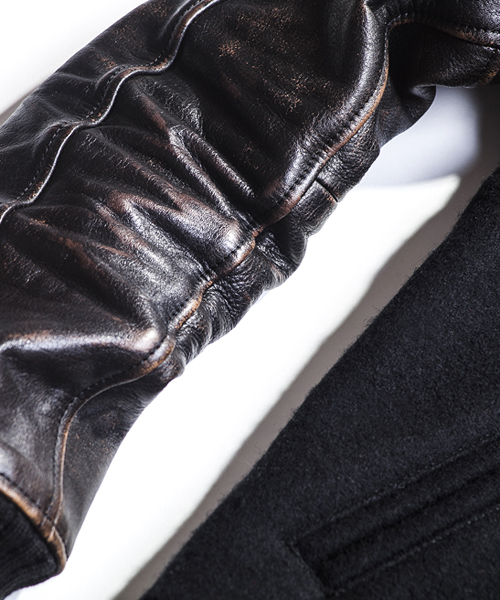 | Quality | ウールに産地、尾張尾州にて丁寧に生産される伝統的な生地を使用。ウール90%ナイロン10%。ナイロンの混紡している事で耐磨性、撥水性、強度を高めている。厚みをしっかり持ち、表面は滑らかで保温性、機能性の高い上質なメルトン生地。袖のグローブレザーは、大リーガー達が使用するグローブでも用いられる頑丈な日本産のカウレザー。レザーらしいしっかりとした表情も持ちつつ、滑らかな質感を備えている。最初は硬く感じるが、着ていくごとに風合いが増していき、着用者の体になじんだ形へとに変化していくレザー。今回のblack×blackの袖には下地の色を浮き出させる事のできる特殊な染色をした革を使用。 |