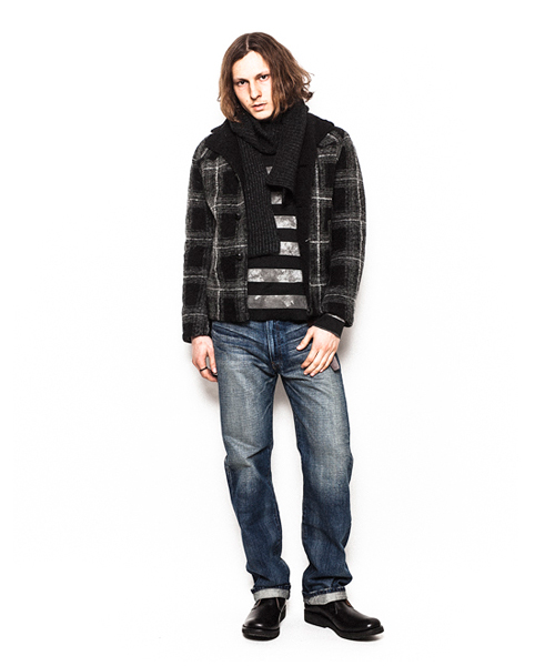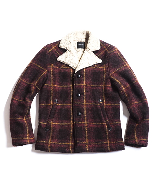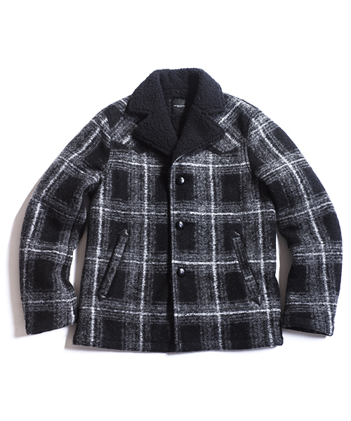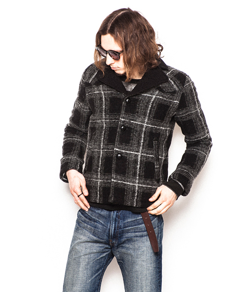 | Detail | 表地にはチェック柄のウールニット生地を使用。身頃裏地には軽くて柔らかな風合いのボアを使用し、袖裏にはキルティング加工を施したキュプラ素材を使用。フロントにはポケットを2つ配置しポケット口には牛側のパッチを追加。釦には革編み釦を使用。軽くて暖かいショート丈のボアランチJKT。 |
