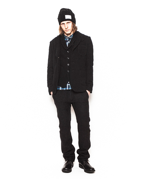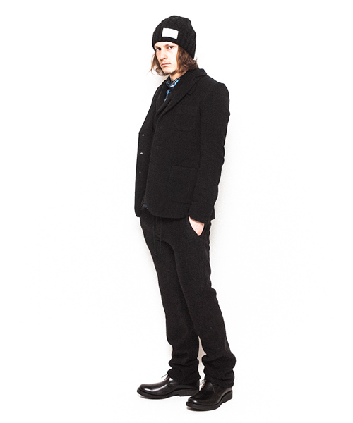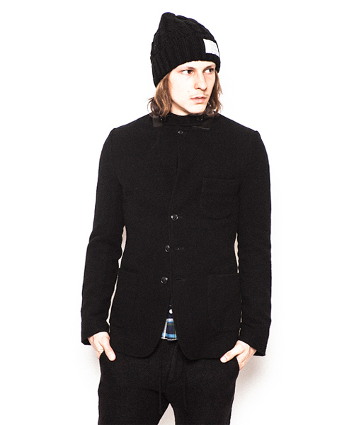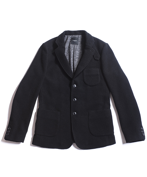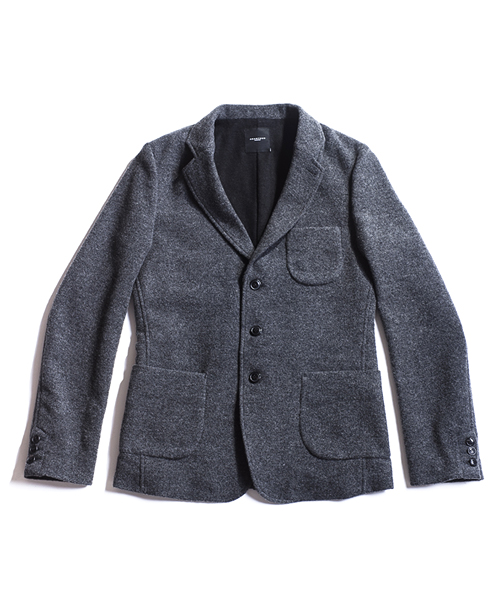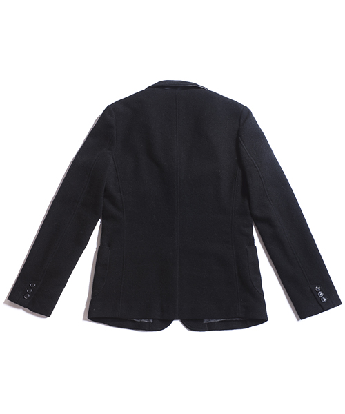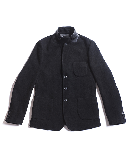 | Detail | 表地にはウールニット素材を使用した3BJKT。襟にはストラップが付属する為ラペルを閉じて着用する事も可能。釦は水牛釦を使用。上裏衿には牛革を使用している。裏地には着心地の良いウール混の天竺生地を使用。袖裏には滑りのキュプラ素材を使用している。肩パッド等は入れずにカジュアルに仕立てた1着。 |