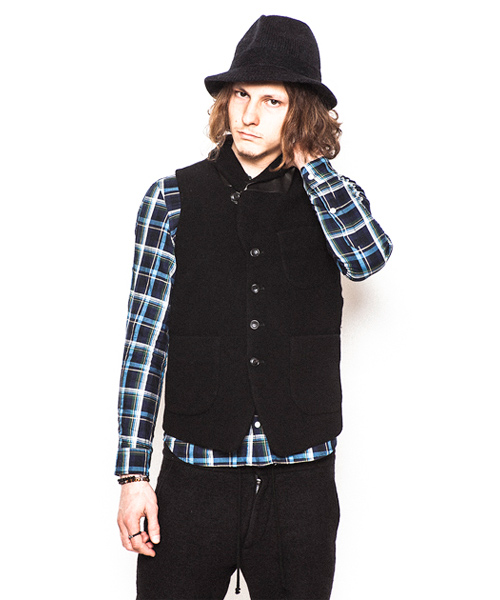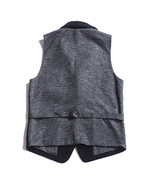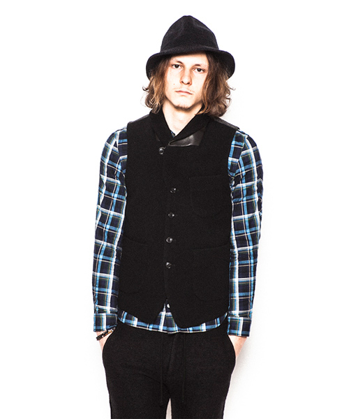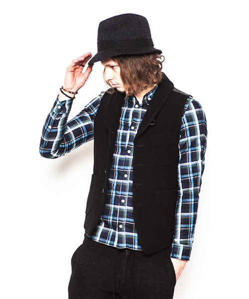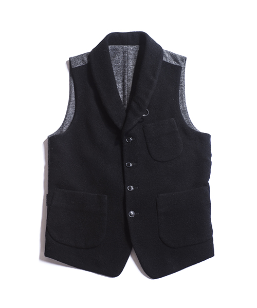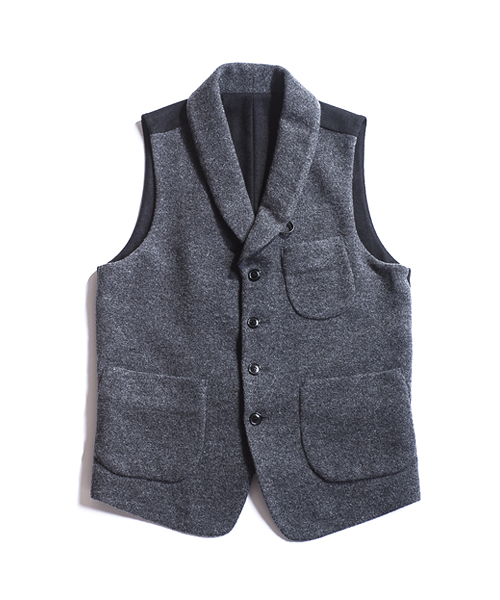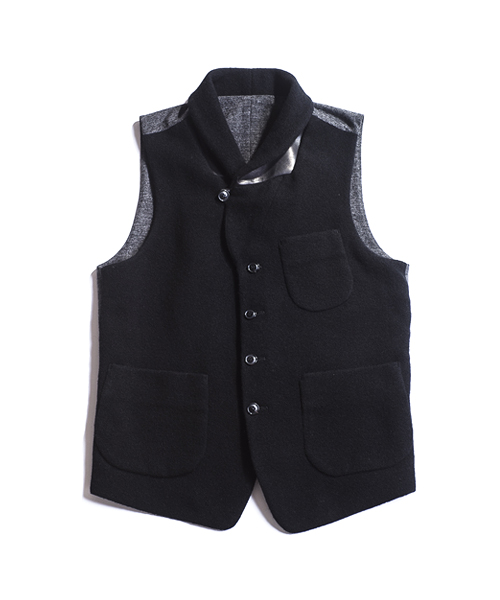 | Detail | 表地にはウールニット素材を使用したショールカラーベスト。襟にはループが付いている為ラペルを閉じて着用する事も可能。上裏衿には牛革を使用している。裏地から後ろ身には着心地の良いウール天竺生地を使用している。釦は水牛釦を使用。WL1303とセット着用も可能。 |