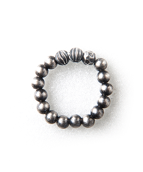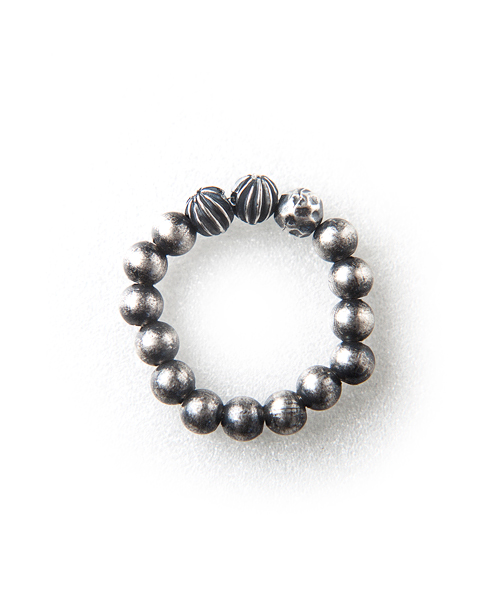 シルバーデザインビーズを使用し、いぶし加工を入れることにより、マットな風合いを演出している。3サイズ展開で重ね付けや、違う指に付けたりと多種多様に楽しめるアイテム。