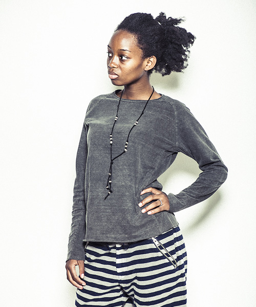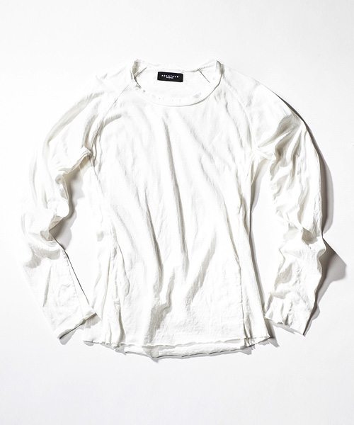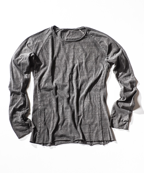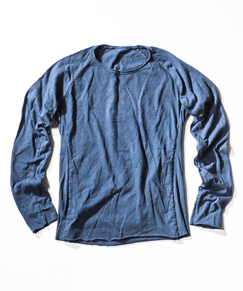 | Detail | ネック部分はカットオフ、裾、袖口共にカットオフに縫製したラグランスリーブのロングカットソー。CT1301同様にインディゴ染め、墨染めは製品加工。白色はボイル洗いをし製品染めと同じように生地を引き締める加工を施している。同じ型でも色によって異なる表情を楽しむ事のできる1枚。 |
