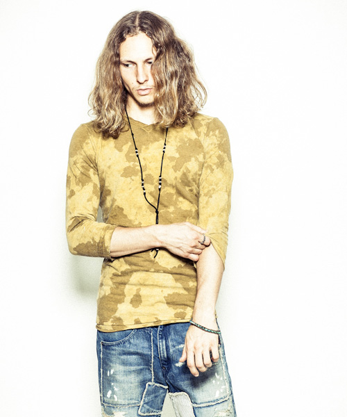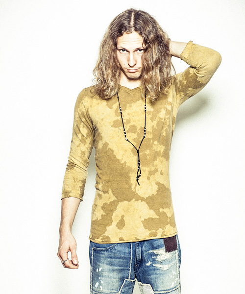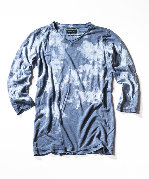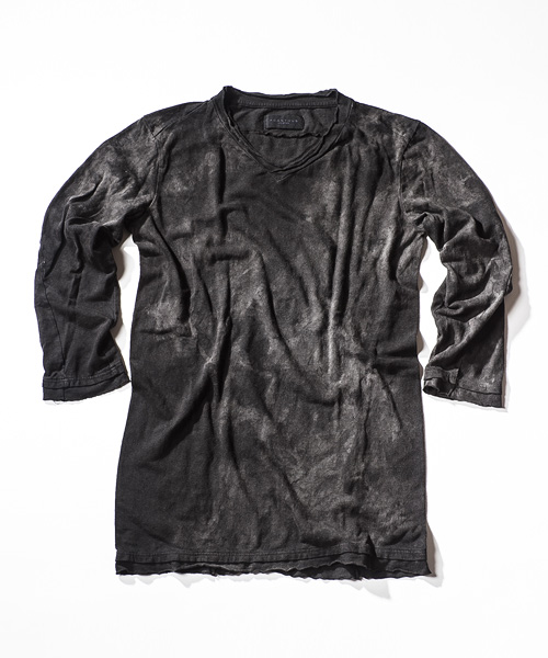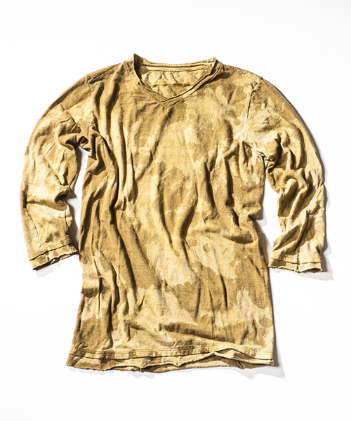 | Detail | 切りっぱなしのVネック、立体的なパターンが特徴的な3/4スリーブのカットソー。袖、裾共に切りっぱなしの生地をたたきつけている。着丈、袖丈共に長めの設定なのでレイヤードスタイルにも活躍する一枚。CT1303と同様に手作業によるムラ製品染めを施している為1点1点異なる味わい深い表情に染め上がっている。 |