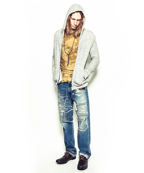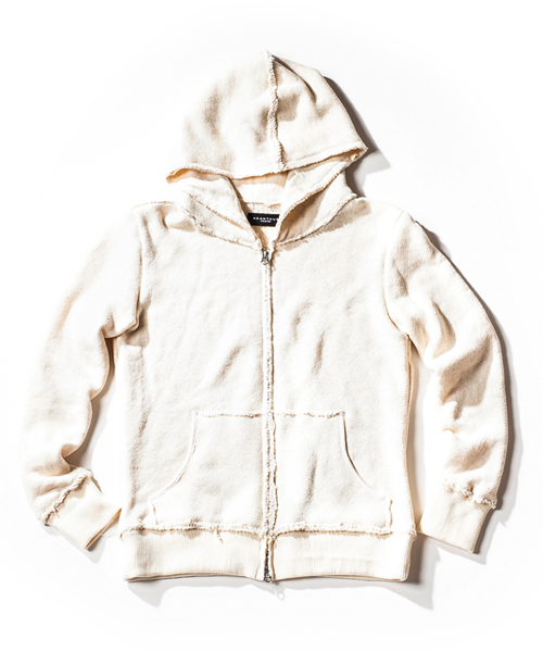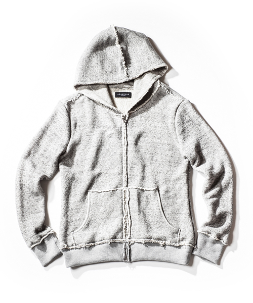 非常にソフトなラフィートップ裏毛素材を使用したパーカー。スタンダートなパーカースタイルに随所にカットオフパーツを配置し表情を追加。ファスナーにはTALONファスナーを使用。伸縮性のある肌触りの非常に良い生地で、程よくタイトなシルエットなので着心地の良さを体感できるスウェットパーカー。