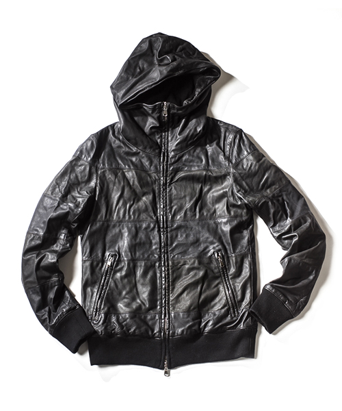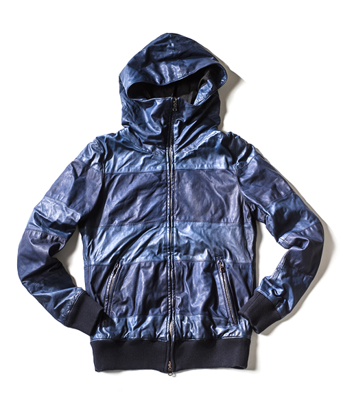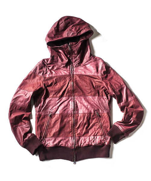 | Detail | エントロフィーノの素材感を生かす為に、シンプルな仕様のハイネックパーカーにて製作。特殊な製品染め用に複雑なパターンを使用している為縫製には職人の高い技術が必要となる。製品染め加工、ドラミング加工の表情がすべて詰まっており他では見る事のできない加工、雰囲気、仕上がりになっている。唯一無二のレザーフーディー。 |