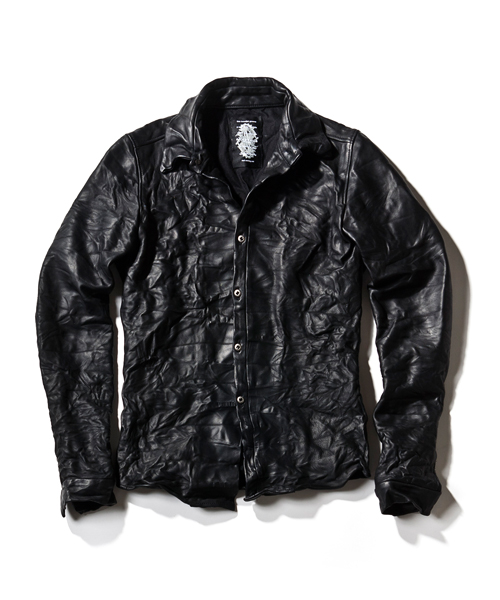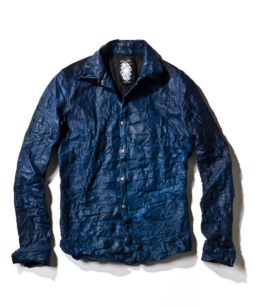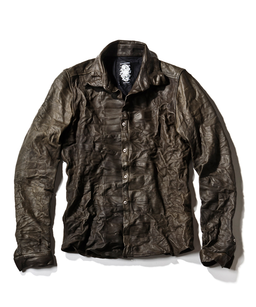 | Detail | ACANTHUSの定番として発表しているオイルドフレンチホースを使用したレザーシャツ。今シーズンから初期シャツのディティールである背中心に入る巻き縫い仕様を追加し、クオリティを向上。着用する度に、着用者によってレザーの表情、シワの変化などその人だけの物へと変化していく。レザーシャツのみ展開の特別な素材を使い、職人による手しわ加工を施した、永久的な逸品と呼べるレザーシャツ。 |