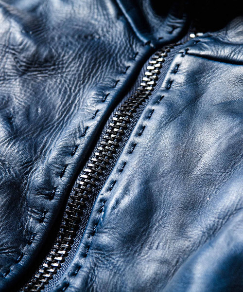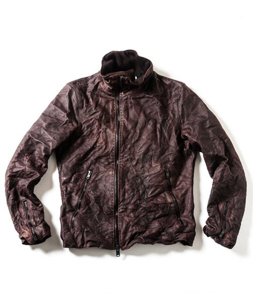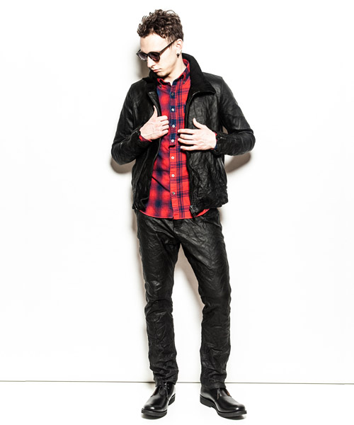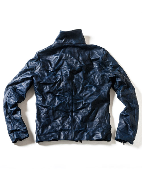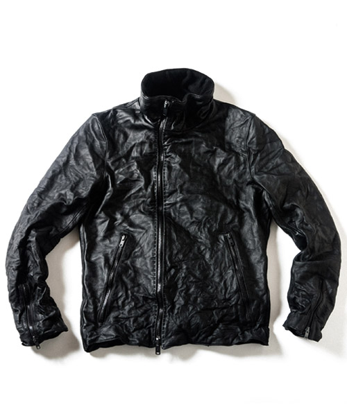 | Spec | フロントファスナーの位置を若干ずらし、衿を高めに設定したシングルライダースデザイン。 |