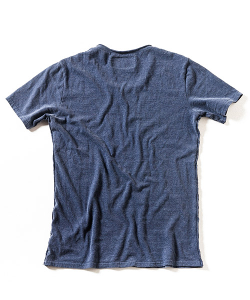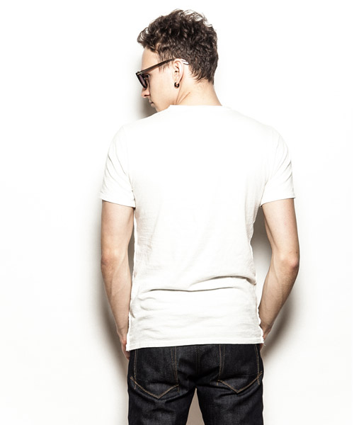 | Material | ラフィー 天竺。生地の製造工程での落綿を80%以上使用し、紡績のスピードを落とし丁寧に紡出する事で柔らかい風合いに仕上げた天竺生地。落綿使用による、荒々しさの中に柔らかさとしなやかさを持ち、そのムラ感は機械的には作れない絶妙な味を表現している。 |