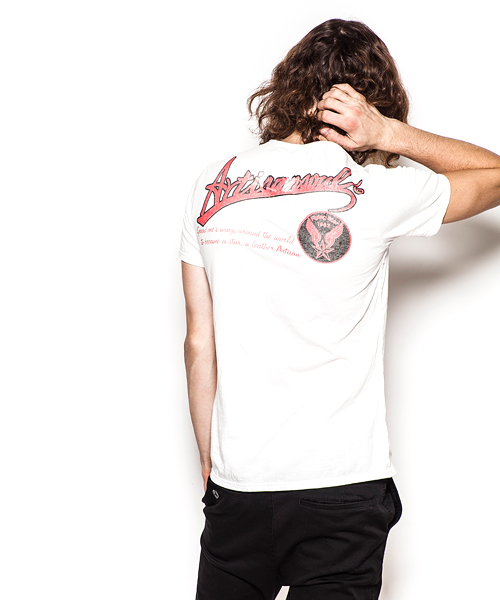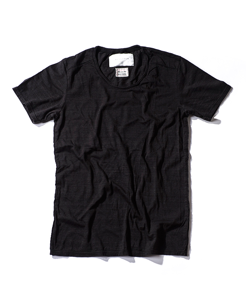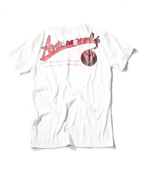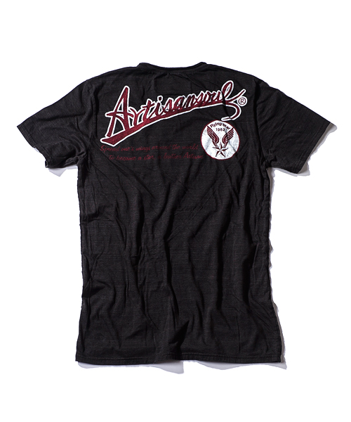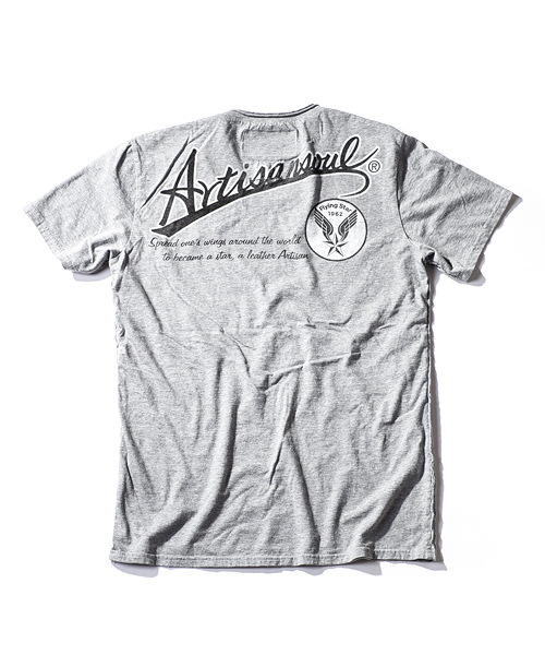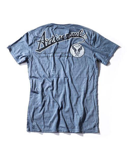 | Detail | 定番的にリリースしているTシャツのアップデートモデル。CT1401に絶妙な配置で後ろ身頃上部に"Artisan soul"かすれロゴプリントを施している。今回は肩に切り替えパーツを追加し、特殊ミシンによるハシゴステッチを追加。首元は切りっぱなし仕様、修正を重ねた程よく開いたネックラインを採用。脇には切りっぱなしのパーツを挟み込み縫製した、独特なパイピング仕様。特殊染色を施した先染め糸を使用した生地を使用し、さらに縫製後ウォッシュ加工を施す事でヴィンテージ調の風合いをさらに増させている。細部の仕様に拘ったベーシックな1着。 |
