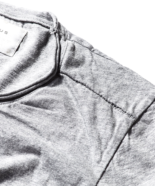 | Material | Vintage Foggy dye 天竺:特殊染色を施した先染め糸を使用し、製品を洗いこんだようなヴィンテージ調の風合いを表現。インディゴ染料や顔料の様に、摩擦堅牢度や色落ちの心配が無い。霧がかかったようなスモーキーカラーが特徴的な生地。 |