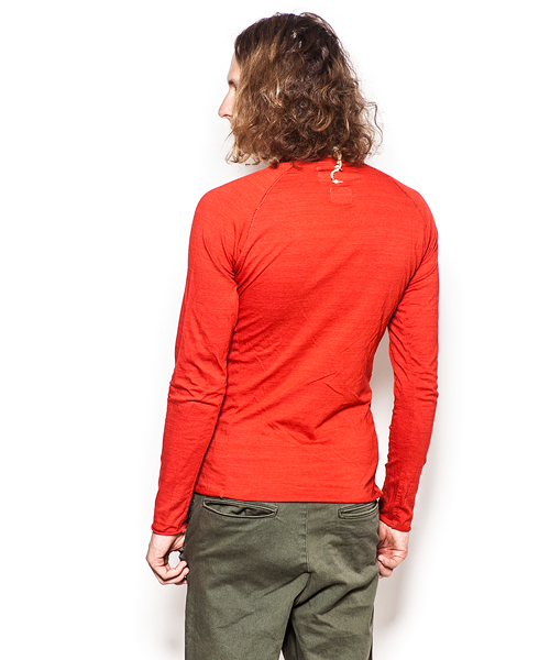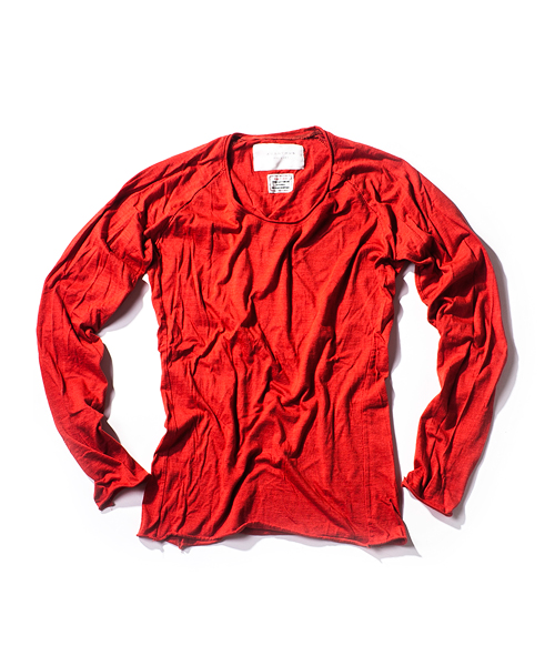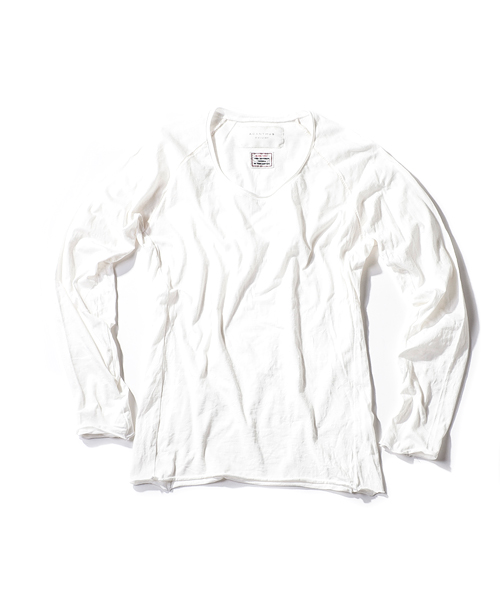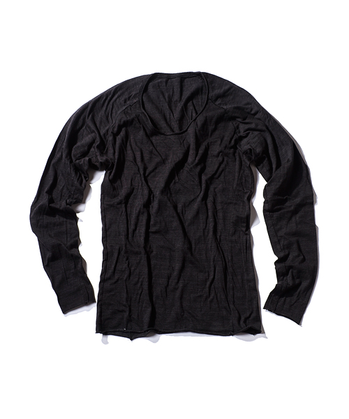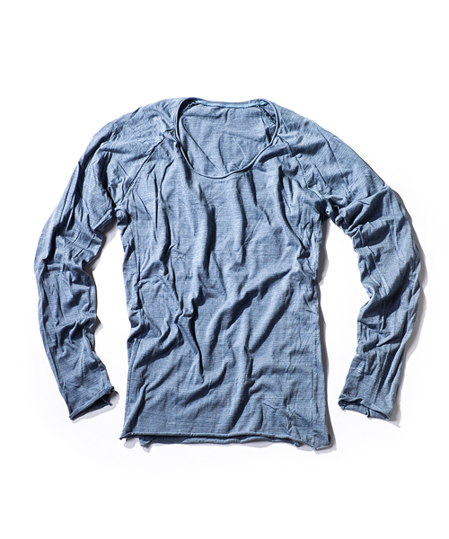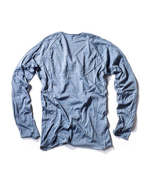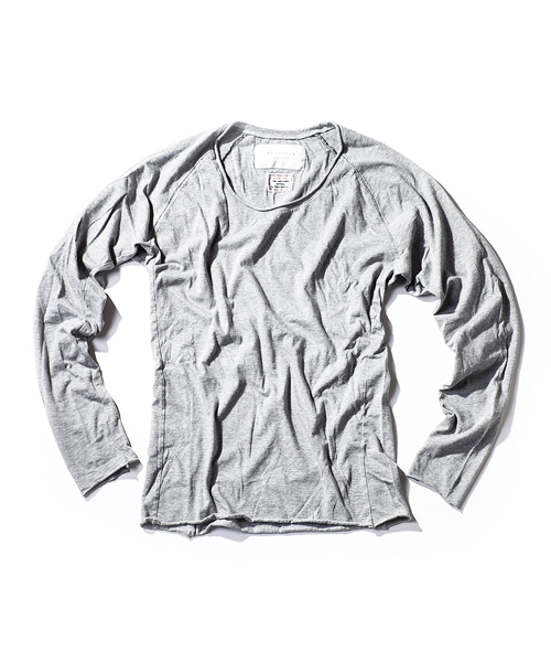 | Detail | 定番的にリリースしているロング丈のTシャツのアップデートモデル。今回はラグランスリーブの切り替えに特殊ミシンによるハシゴステッチを追加。首、袖、裾は切りっぱなし仕様、修正を重ねた程よく開いたネックラインを採用。特殊染色を施した先染め糸を使用した生地を使用し、さらに縫製後ウォッシュ加工を施す事でヴィンテージ調の風合いをさらに増させている。細部の仕様に拘ったベーシックな1着。 |