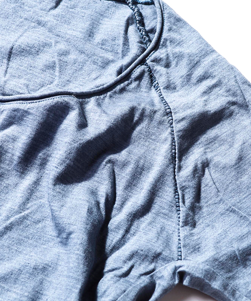 | Material | Vintage Foggy dye 天竺:特殊染色を施した先染め糸を使用し、製品を洗いこんだようなヴィンテージ調の風合いを表現。インディゴ染料や顔料の様に、摩擦堅牢度や色落ちの心配が無い。霧がかかったようなスモーキーカラーが特徴的な生地。 |