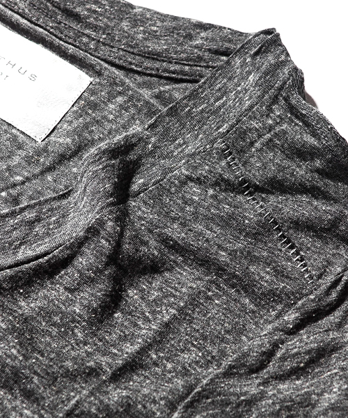 | Material | 30Sビスコース麻天竺:後染めのレーヨン、リネン混紡の天竺素材。レーヨンの滑らかな生地感と、リネンの涼しげな生地感が合わさった万能素材。リネンのネップ感により杢調な表情が特徴。 |