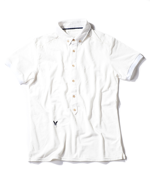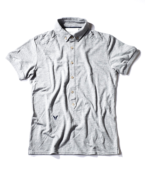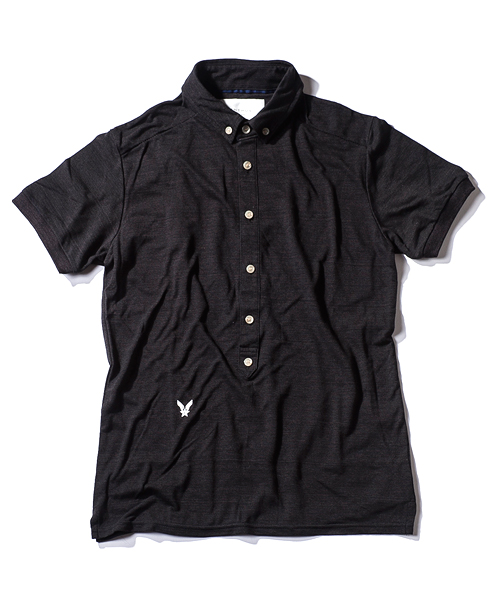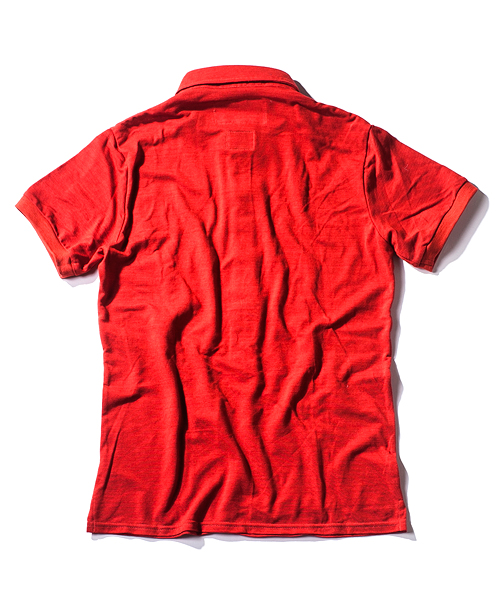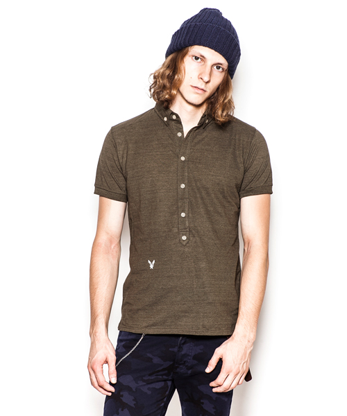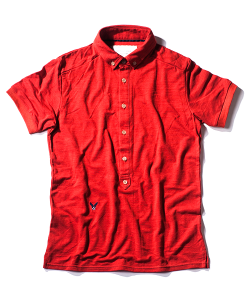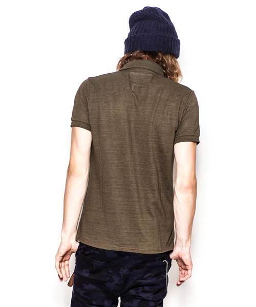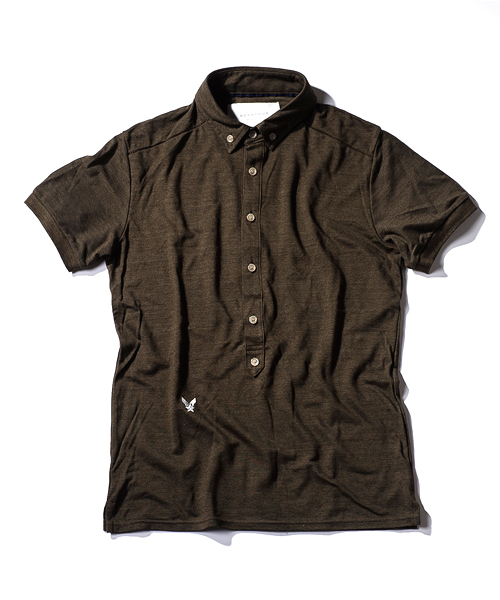 | Detail | ヴィンテージライクな鹿の子素材を使用したのポロシャツ。小さめのB.D衿、長めに設定された前立て、身頃左下に入るロゴ刺繍、袖口のリブ仕様が特徴的な1着。肩の切り替えには特殊ミシンによるハシゴステッチを施している。釦にはACANTHUS刻印入りのオリジナル釦を使用。縫製後にワンウォッシュ加工を施している。 |