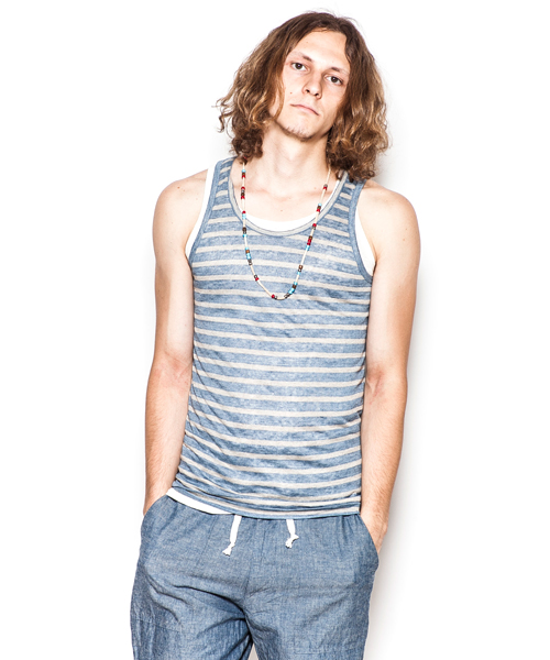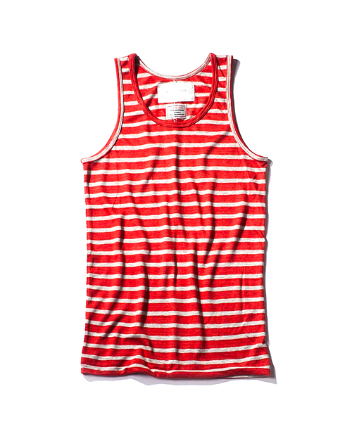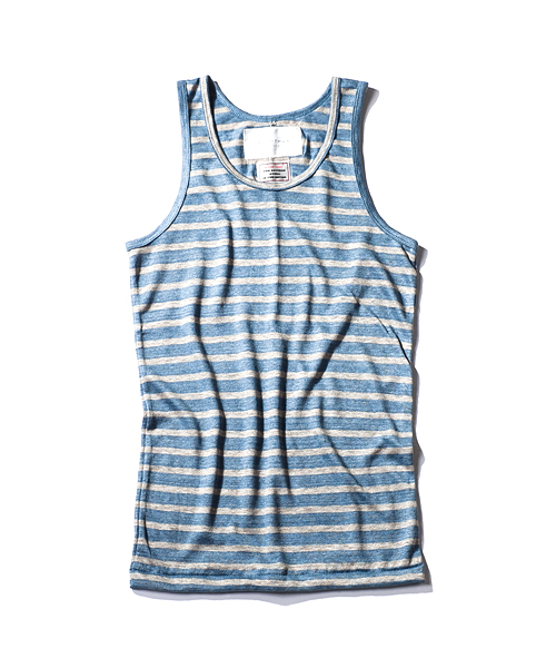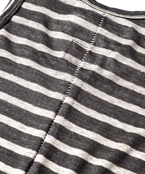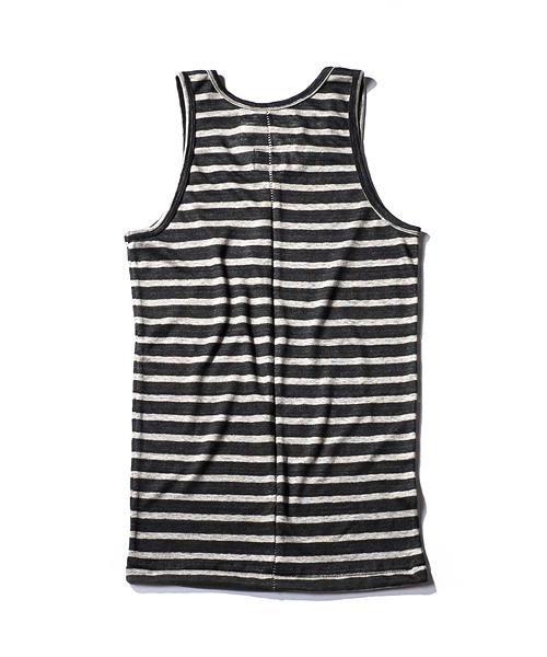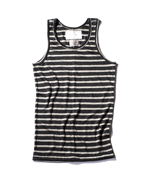 | Detail | 上質なリネン100%のボーダー柄の天竺を使用したタンクトップ。上質な素材を生かし、シンプルな仕様、シルエットに設定。後ろ身頃の縦の切り替えには特殊ミシンによるハシゴステッチを施している。インナーとしてはもちろん、生地の透け感を生かし重ね着にも対応できる1着。 |