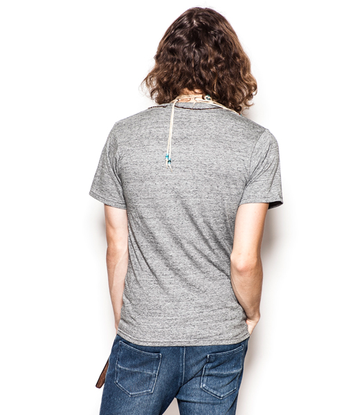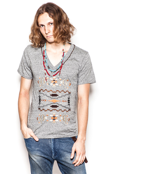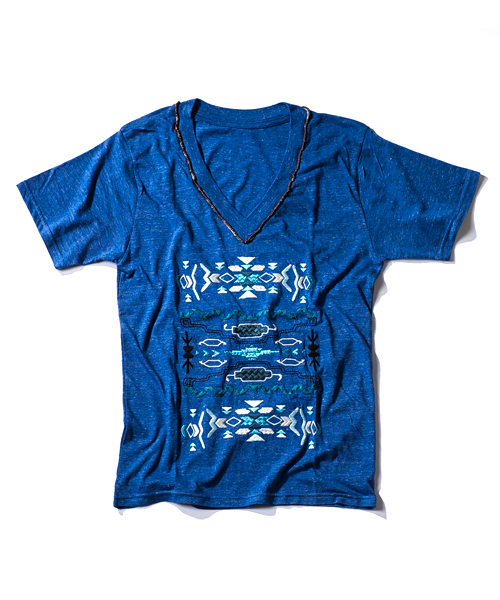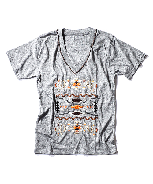 若干深めのVネックデザイン。複雑な民族刺繍と衿周りのビーズ刺繍が特徴のカットソー。