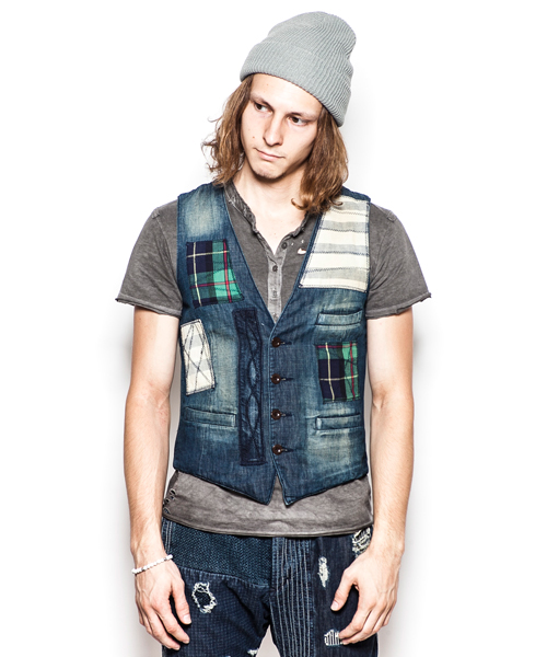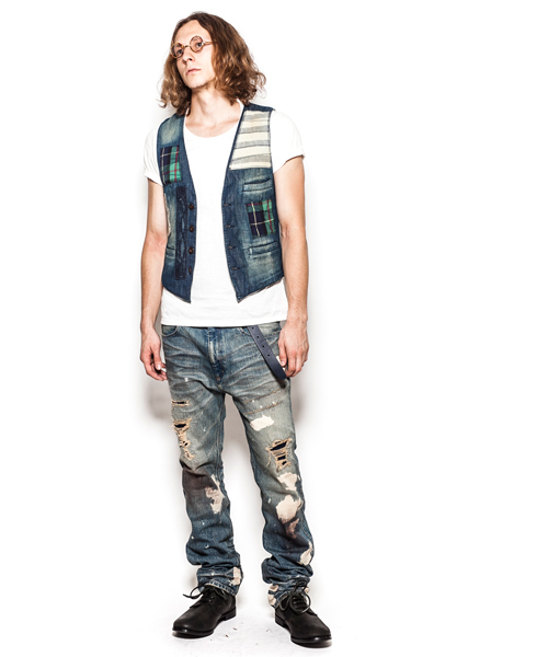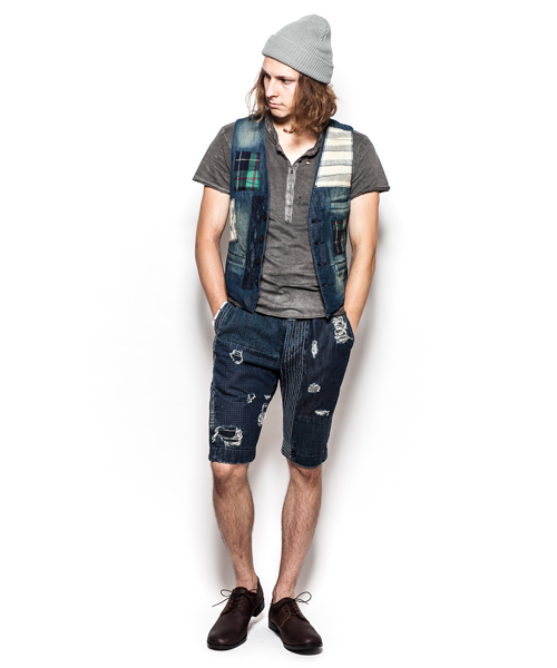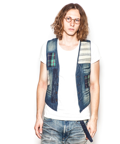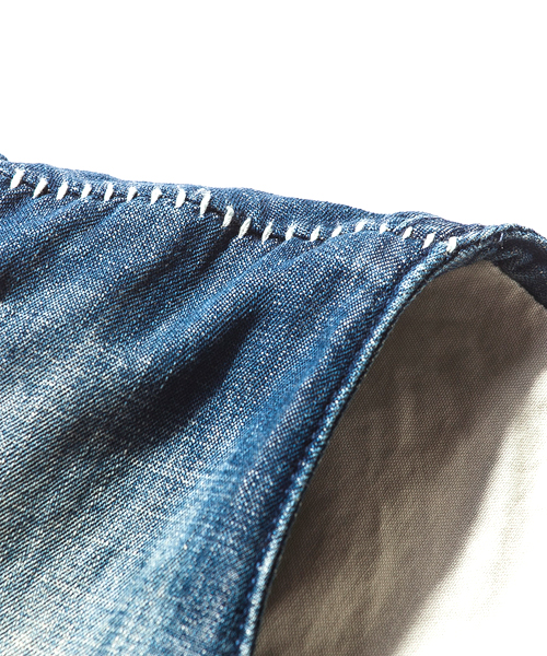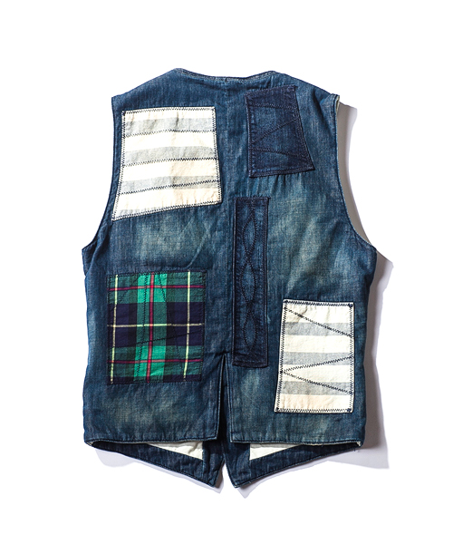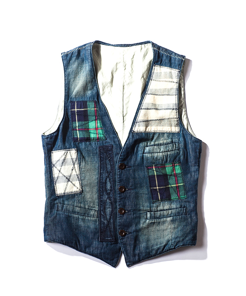 | Detail | 3種類の生地を使用した4Bデニムジレ。大胆なパッチワークをステッチワークで変化のある表情に。釦には水牛釦を使用している。若干細身のシルエット。縫製後ワンウォッシュを施している為、パッチワークの生地感をより風合い良く仕上げている。 |