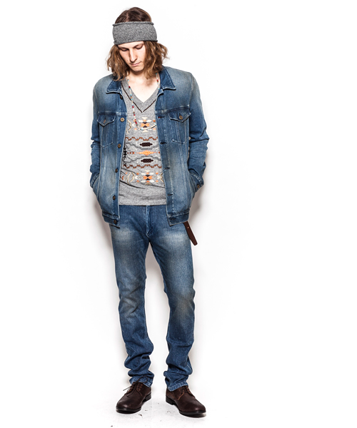 | Material | ヴィンテージニットデニム:市場に出ているニットタイプのデニムは主に2通りある。布帛の織りで出来ているニット風デニム。網のニット編みで出来ているニットデニム。今回のニットデニムは後者の物で、網のニットデニムは柔らかさと、実際に形となった時の見た目と触り心地のギャップを感じとる事ができる。何よりも、軽さと風合いが良く、加工が映えるニット素材。デニムと同様に芯が染まっていないインディゴ染めの糸を使用している為、非常にデニム近い加工感を表現できる。 |